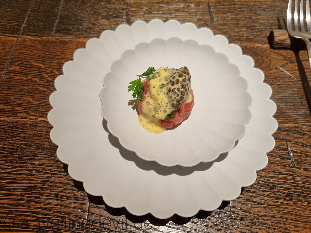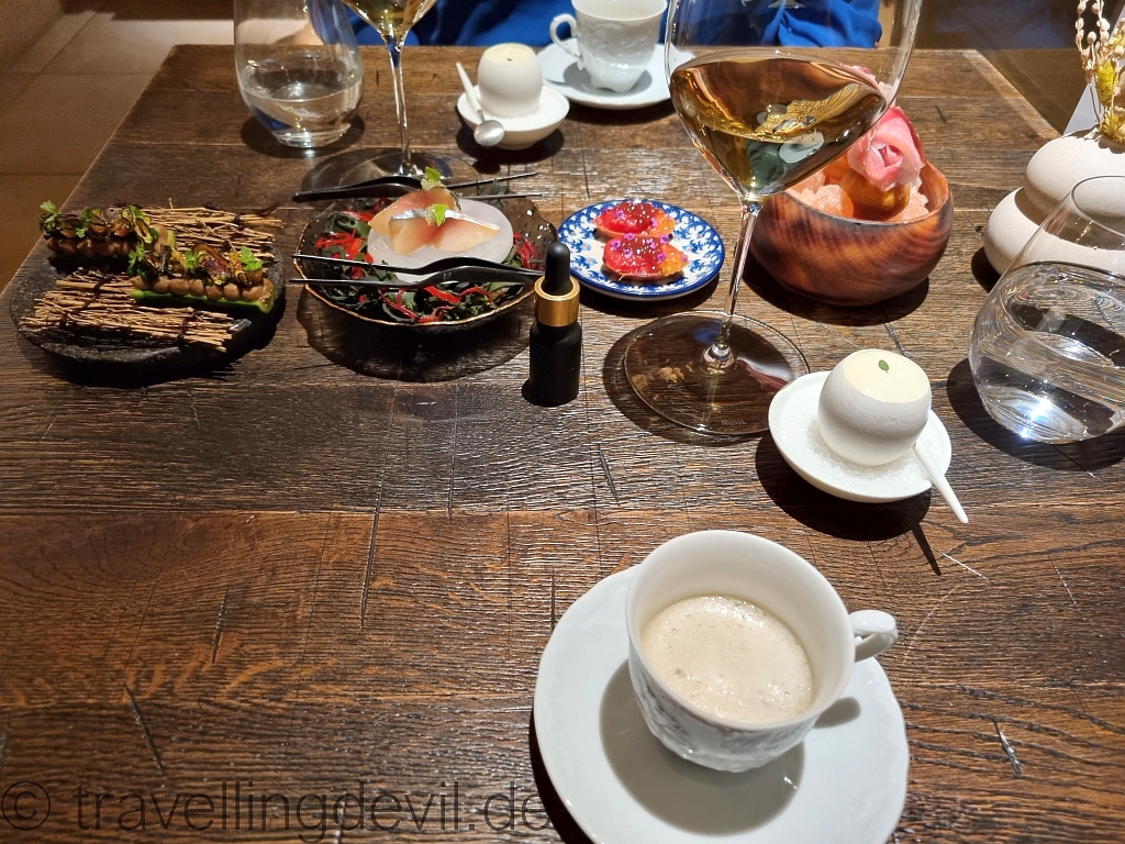 Wir waren begeistert. Am Pass ging es derweil zu wie in einem Bienenstock, Teller kamen und wurden von dem immer netten Service an die Tische gebracht. Von denen man wenig mitbekam, da in einem Raum immer so 2-3 Tische stehen und man so recht viel Ruhe hat.