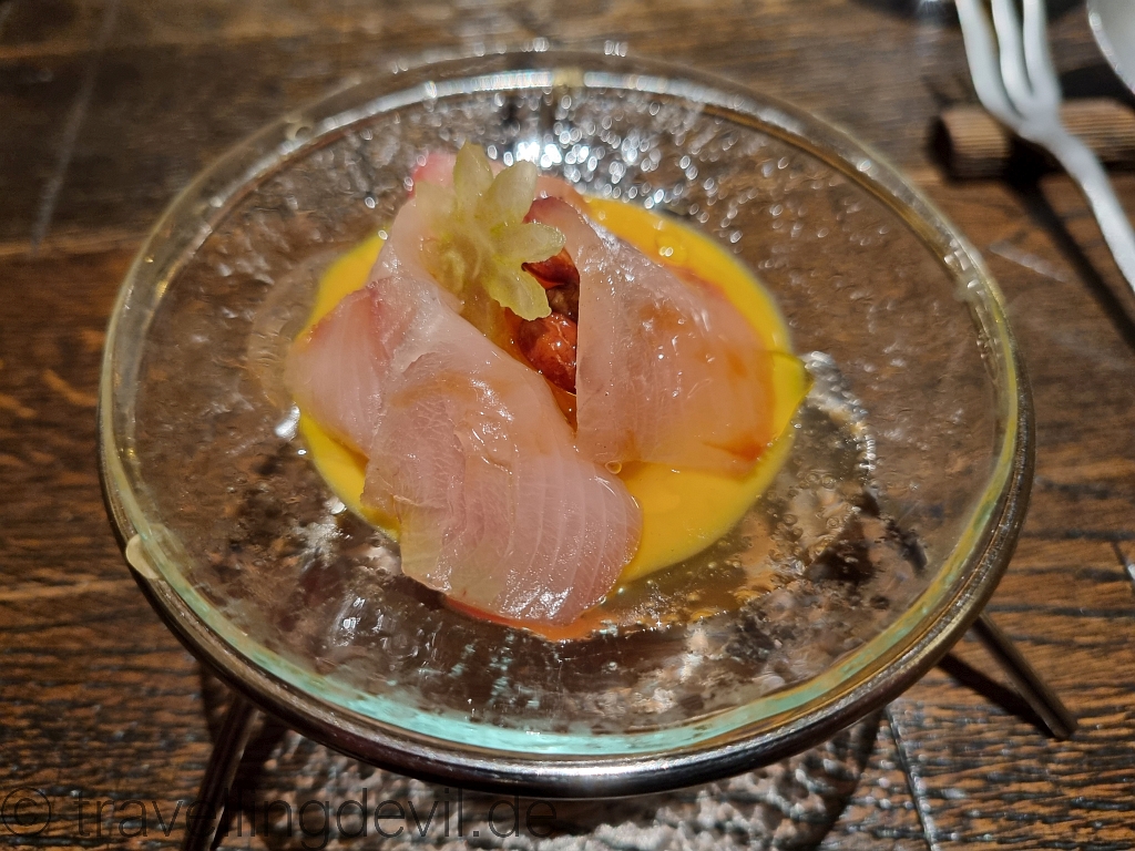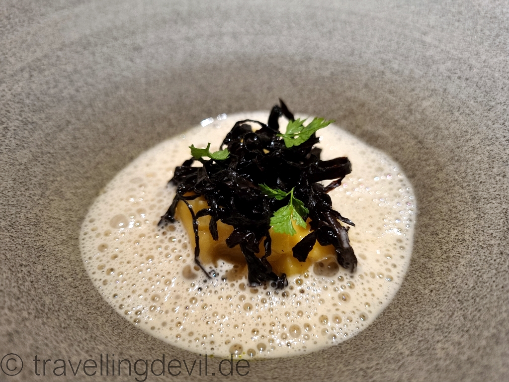 Nächster Gang, ein Klassiker mit einer Reminiszenz an die Jahreszeit: Bernsteinmakrele mit Kürbis. Wieder eine gute Fischqualität, das mit dem Kürbis fanden wir aber irgendwie nicht so passend. Irgendwie wurde so der feine Geschmack des Fisches zu sehr übertönt und der Fisch trug so wenig zum Gesamtbild bei.