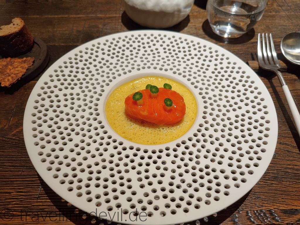 Weiter ging es mit einer Kleinigkeit, nämlich Forellenkaviar und ein Saffrangebäck, und einer Großigkeit, nämlich der dazu gehörenden Forelle mit Gurken und einem Saffranschaum.