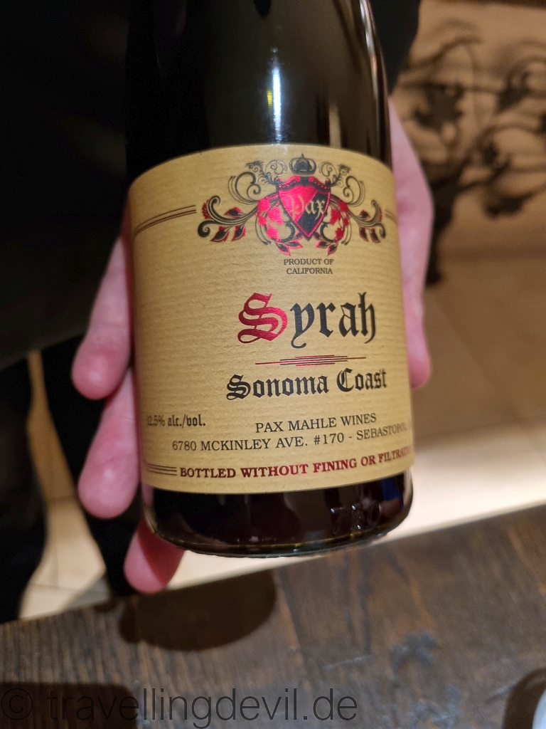 Die Gänge gingen und kamen, das Tempo war aber nicht unangenehm. Im Gegensatz zu sonst hatten wir auch keine Weinbegleitung, sondern uns für zwei gute Flaschen entschieden, was preislich sogar günstiger war. Den ersten Wein haben wir leider nicht aufgeschrieben, der zweite war aber ein klassischer Syrah von Pax Mahle aus Kalifornien.