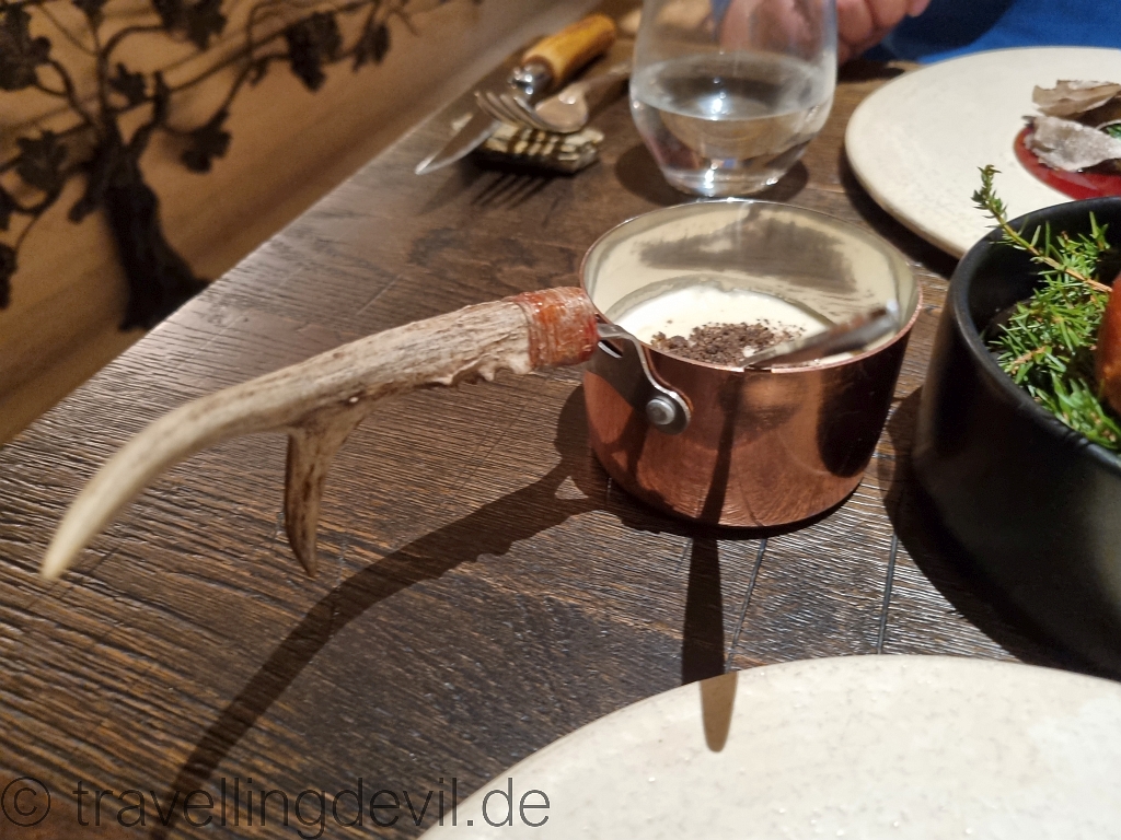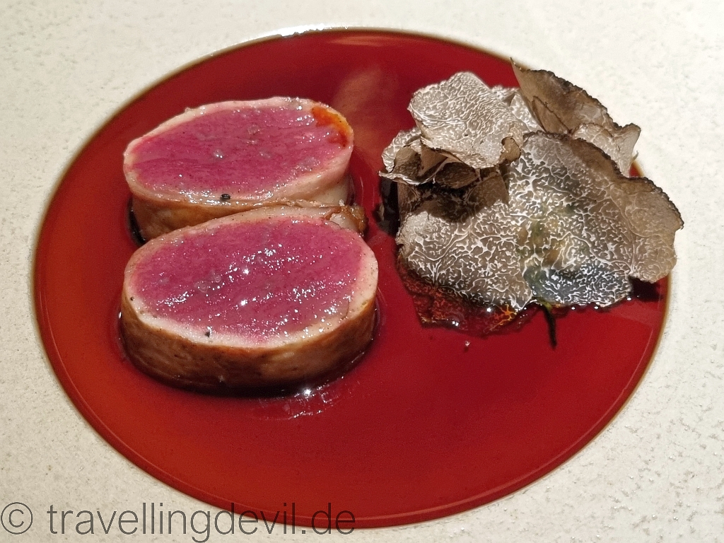 Das Messer deutete es schon an: Es war Zeit für Fleisch. Genauer gesagt vom Chef selber erlegtes Reh, sehr blau gebraten. Dazu Trüffel, eine Kartoffel-Trüffel Creme und eine Sauce zum erneut niederknien.