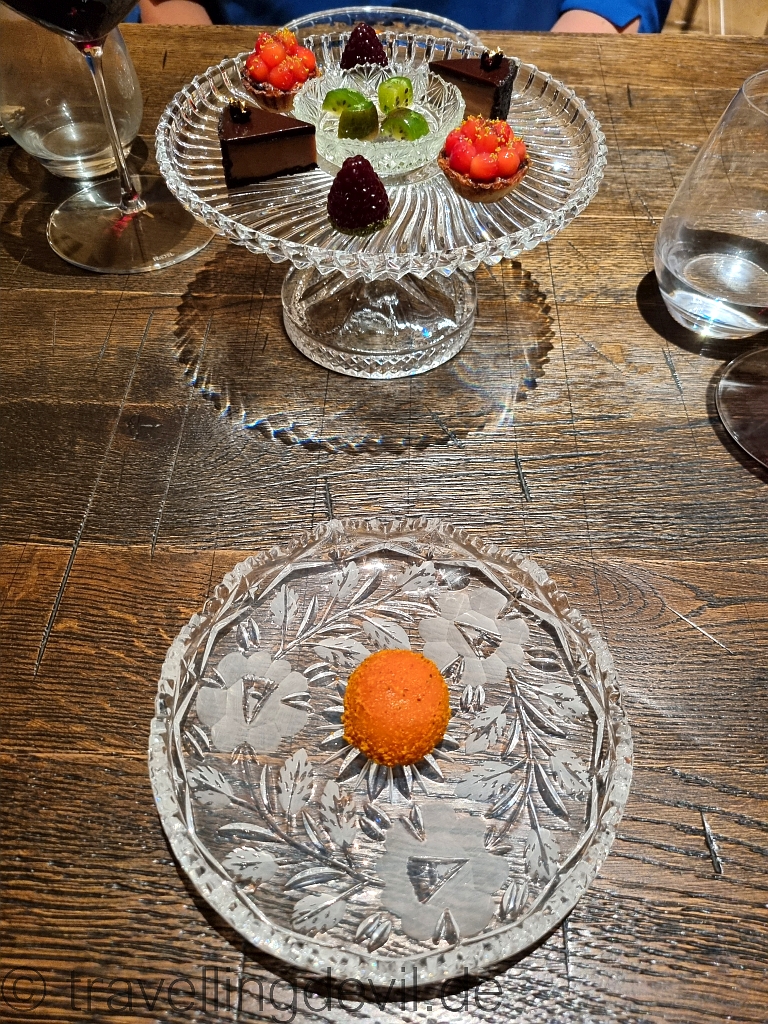 Naja, so richtig Schluss war noch nicht, denn selbstverständlich gab es hier auch ein paar Kleinigkeiten zum Kaffee: Von einem kleinen Schokoladentörtchen über eine kleine Praline mit Blaubeere bis zu einer Kombination aus Karotte und Sanddorn.