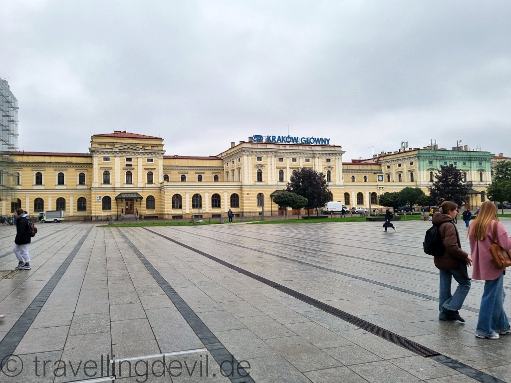 Das Gebäude hat anscheinend keine wirkliche Funktion mehr, denn zu den Bahnsteigen geht es vom Foto und dem großen Platz aus ein Stück nach Links. Krakow Glowny ist der zentrale Hauptbahnhof von Krakau und ein wichtiger Knotenbahnhof für Verbindungen innerhalb Polens und ins Ausland. Es bestehen internationale Verbindungen in Richtung Berlin, Budapest, Hamburg, Lemberg, Odessa, Prag und Wien. Innerhalb Polens ist nahezu jede größere Stadt ohne Umsteigen erreichbar – sowohl über Tag als auch teilweise über Nacht in Schlaf- und Liegewagen. Der Bahnhof wurde 1847 eröffnet und mehrmals erweitert und modernisiert. Seit Februar 2014 befindet sich das Bahnhofsgebäude mit Fahrkartenschaltern etc. unter den Gleisen.