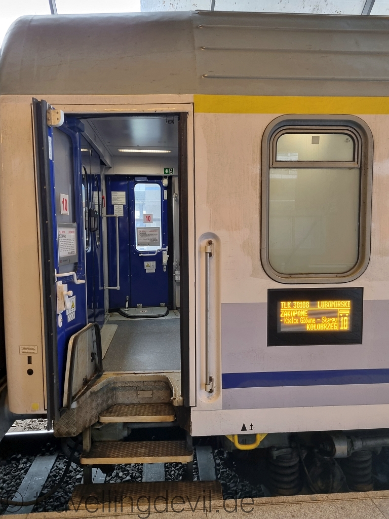 Unser TLK Zug kam auch recht pünktlich an. TLK ist die Abkürzung für „Twoje Linie Kolejowe“, zu deutsch in etwa „Deine Bahnlinien“ und ist eine von PKP Intercity angebotene eigene Zuggattung in Polen. Preislich ungefähr wie die InterCity Züge angesiedelt werden die TLK Züge aber mit älterem Zugmaterial bedient. Es gibt auch Expresszüge, die kosteten aber für unsere Fahrt etwa das fünffache.