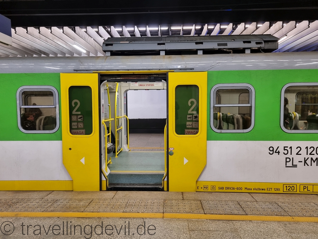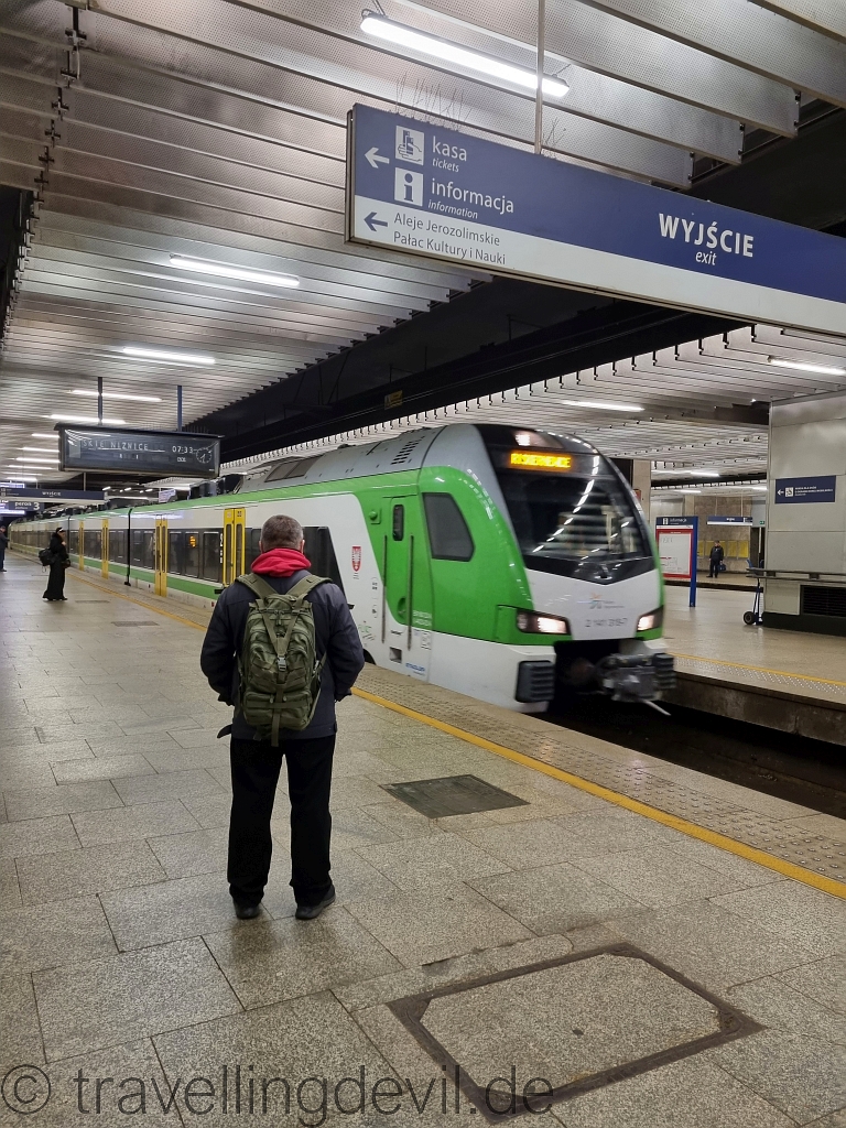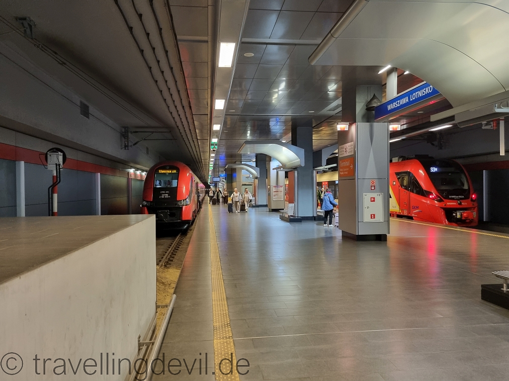 Die Züge fahren hier selbst am Sonntagmorgen in einer ordentlichen Frequenz, zwei Eisenbahnbetreiber (Koleje Mazowieckie und Szybka Kolej Miejska) fahren hier mit ihren Fahrzeugen durch. Beide fahren auch die Strecke bis zum Flughafen und insofern konnten wir in die nächste Bahn einsteigen und uns einen Sitzplatz frei aussuchen.