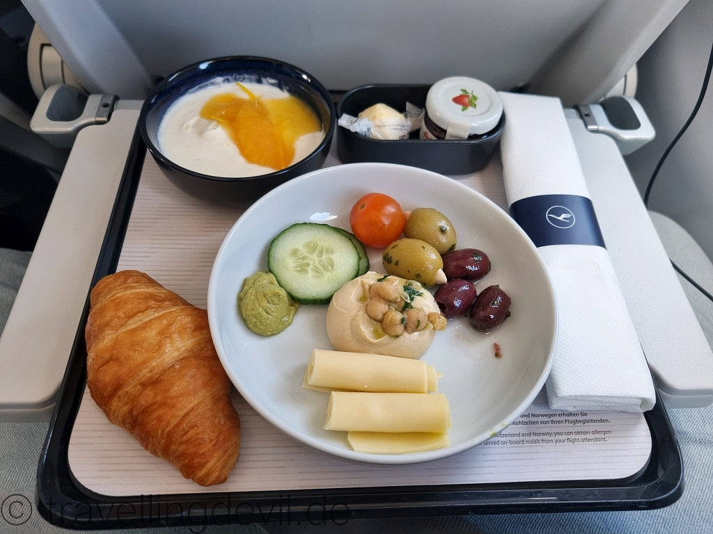 Ein kurzer Weg zur Startbahn, Triebwerke auf Vollschub und ab ging es zurück nach Deutschland. Nachdem die Reiseflughöhe erreicht war, gab es auch ein kleines Frühstück. War ok, auch wenn Jens zuerst, obwohl die Business Class nicht voll belegt war, kein Brötchen bekam und das sehr schade fand. Croissants passen auch nicht so richtig zu Hummus, Oliven und Käse.