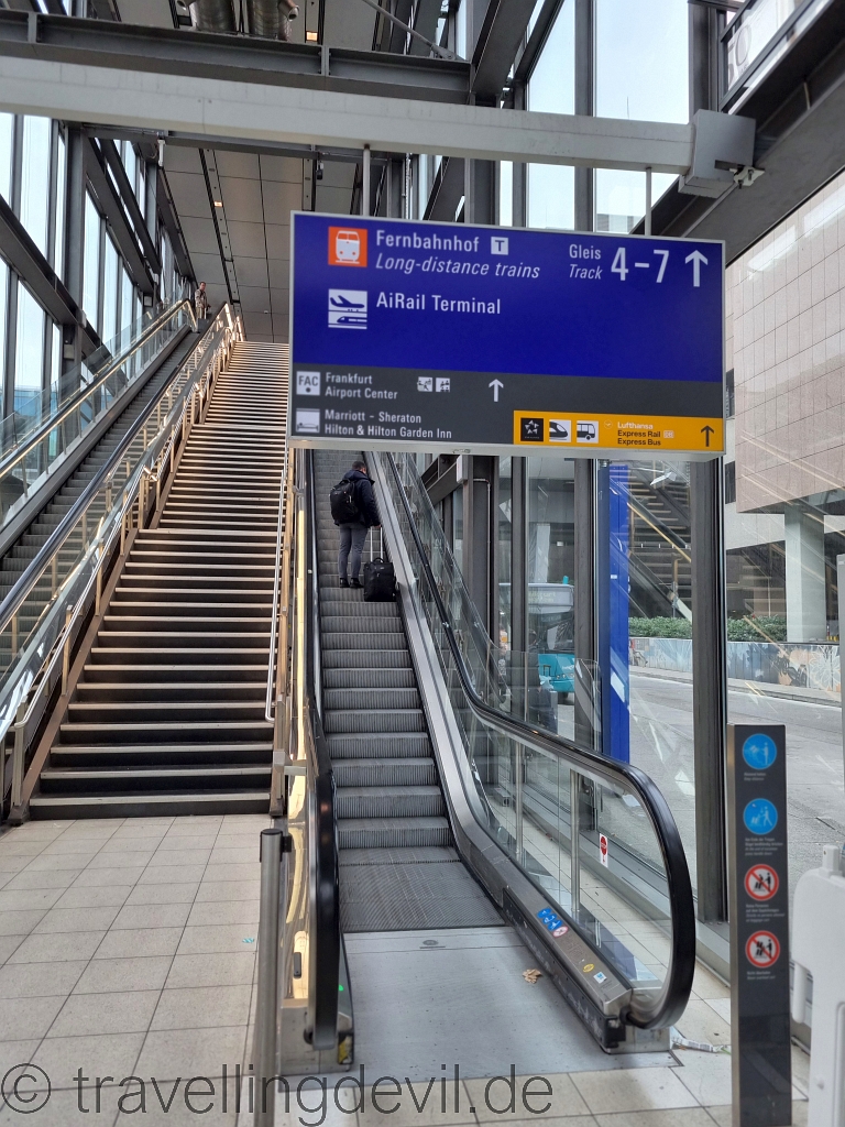 Den Weg vom Terminal zum Bahnhof kennen wir fast schon im Dunklen. Und er ist immer noch echt nervig, denn man muss vom Baggage Claim, wo unsere Koffer ja nicht sind, da sie zum AirRail-Terminal weitertransportiert werden, erst einmal durch die Fressmeile mit Burger King, McD und anderen Fast-Food Ketten, am S-Bahnhof mit seinen teilweise doch eher zwielichtigen Menschen zu diesen beiden Rolltreppen, um dann durch einen Schlauch aus Metall zum Bahnhof und dem „Hier sollte ihr Koffer stehen … irgendwann“-Bereich zu gelangen.
