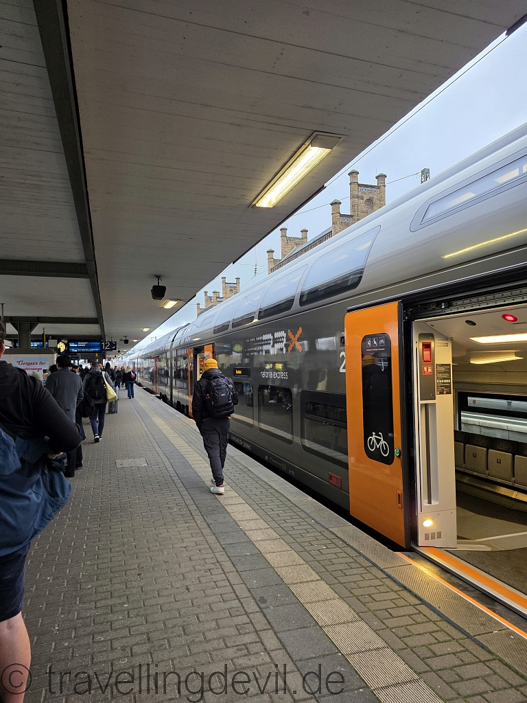 Für uns hieß es: Auf dem Bahnsteig stehen, warten und hoffen, dass der RE60 oder RE70, beide konnten wir nehmen, keine Verspätung hat. Diese beiden Strecken verbinden Bielefeld beziehungsweise Rheine über Minden mit Hannover und Braunschweig. Es gäbe auch eine S-Bahn von hier nach Hannover, aber die dauerte uns zu lange.