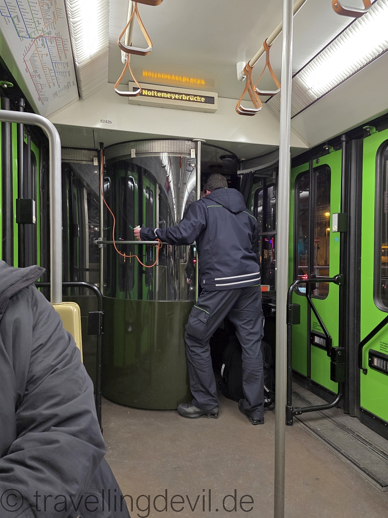 Mit der Linie 13 ging es dann durch die Nacht. Spannenderweise war dies wohl eine Fahrschulfahrt und der Fahrlehrer hatte einen Nothalt-Knopf in der Hand, sollte der Schüler etwas übersehen. Hat er aber nicht, es wurden alle Haltestellen vorschriftsmäßig erreicht. Und gebimmelt hat er auch oft genug, finden wir zumindest.