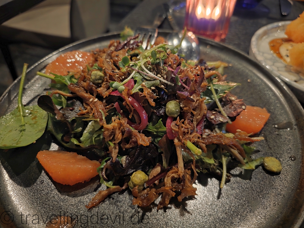 Da wir eher was ausprobieren wollten, bestellten wir erst einmal ein paar Starters und hofften hier nicht zu hungrig gewesen zu sein. Ging tatsächlich, denn die Lobster Spring Roll, die Meike natürlich haben wollte, und ein weiteres Gericht was Jens haben wollte, war leider aus. Also gab es ein echt super leckeren Entensalat mit Pomelo und Wasabinüssen. Was schon mehr oder weniger das Highlight des Abends war, super bitter, fettig, salzig – alles dabei.