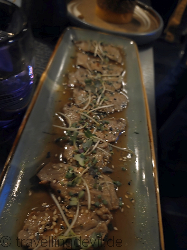 Das Beef Tataki war leider etwas enttäuschend, sehr durch. Dafür waren die Weine aber gut und so verbrachten wir einen schöne Abend mit etwas Alkohol, guten Gesprächen und der ein oder anderen Beobachtung an den Nachbartischen.
