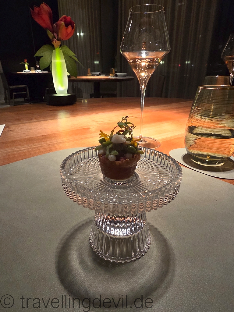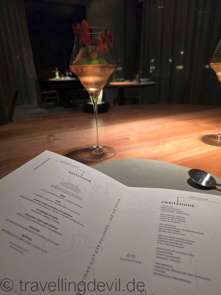Im Restaurant, was nur eine Handvoll Tische hat, bekamen wir einen schönen Tisch und wurden auch gleich von Sommelier Jonas Gohlke und der Chef de rang Mareke Teicke umsorgt. Viel mehr Servicekräfte gab es hier auch nicht, die Schwierigkeiten in der gehobenen Gastronomie Personal zu finden beziehungsweise zu halten merkt man auch hier. Für uns ist das teils auch was schönes, denn so werde oft die Köche „gezwungen“ uns zu bedienen und wir können direkt doofe Fragen stellen. Unsere Auswahl war wieder klassisch mit „Menu und Weinbegleitung“, wobei hier 5 zusätzliche Gänge möglich waren, von denen wir auch drei orderten. Also zusammen, denn wir wollten den Abend nicht dadurch trüben, dass wir mit vollen Mägen am Ende hier rausrollen.