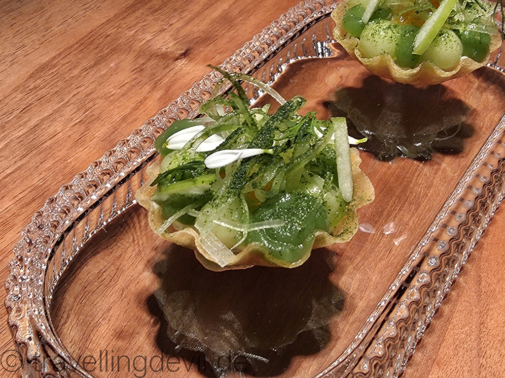 Nächster Gruß war ein Tartlet gefüllt mit Forelle, Apfel und Gurke. Auch wieder vermeintlich einfach aber trotzdem schön anzuschauen und vor allem super lecker.