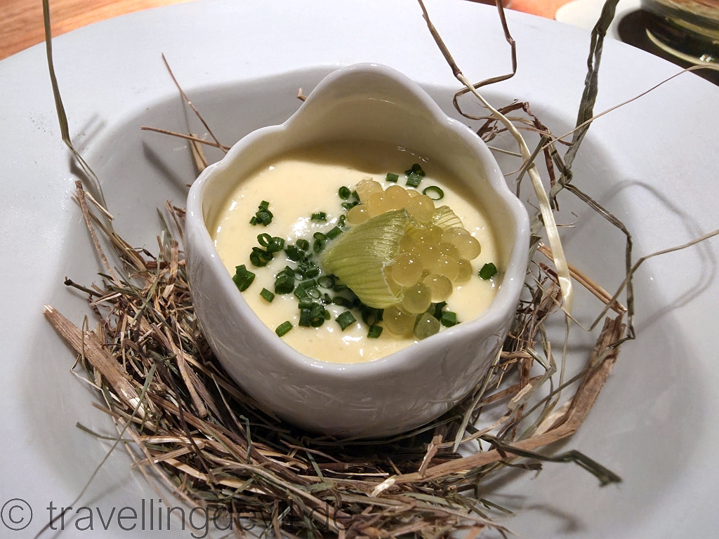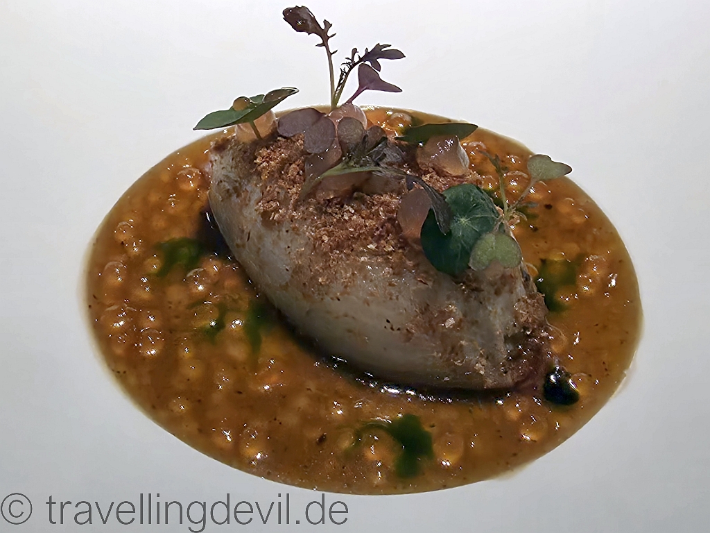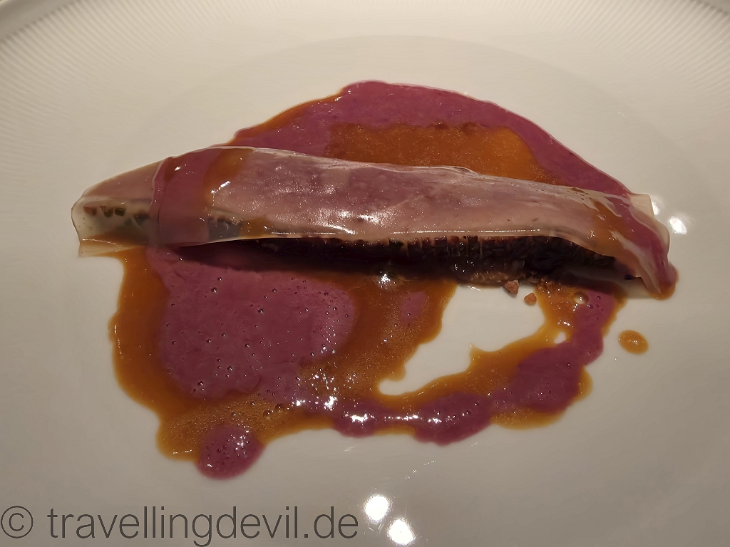 Eine mit einer überraschend festen Alge ummantelte Creme aus Kürbis und Saffran, gefüllt mit Jakobsmuschel. Fantastisch! Richtig maritim und durch den Kürbis und den Safran wiederum nicht eindimensional vom Geschmack her. Die Muschel war super von der Textur her und so war das wieder einer dieser Gänge, die man einfach inhalieren musste, so lecker war das.