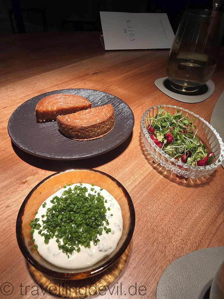 Zeit für das Brot, was auch hier wieder zelebriert wurde. Und zwar gab es ein Sauerteigbrot mit Schnittlauch-Schmand und eine New York Roll mit Aubergine-Granatapfel.