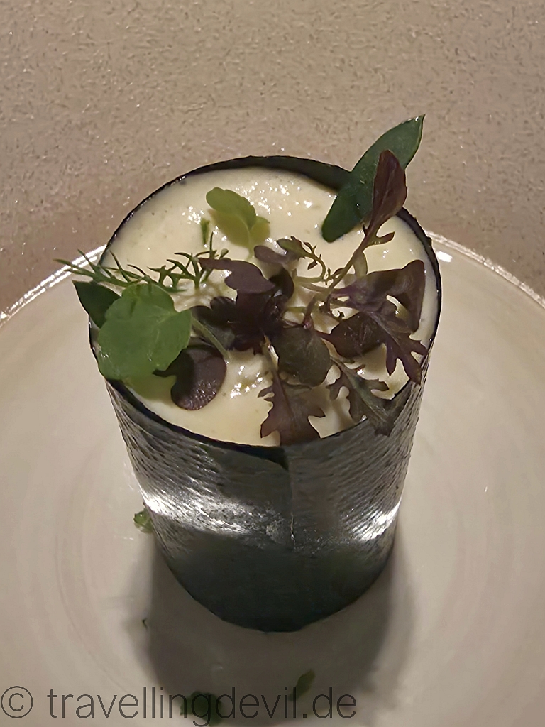 OK, Puls wieder runterfahren und Zeit für das Pre-Dessert. Auch hier modern und eine nette Anlehnung an Griechenland, denn es gab schwarzen Knoblauch, Gurke und Joghurt.