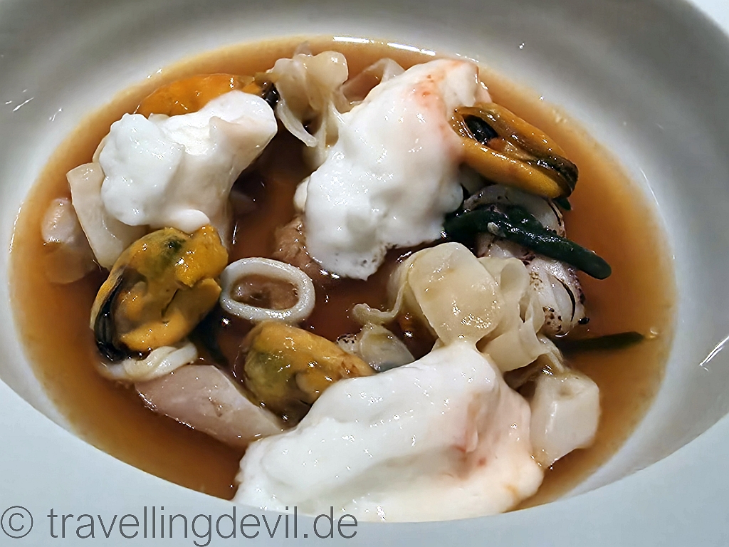 Das Ganze erinnerte an eine Art „Nordsee-Bouillabaisse“, wenn der Vergleich erlaubt sei. Und war wieder hervorragend. Kein Fehlton, alle Meeresfrüchte schmeckte man gut heraus, der Kalmar ist fest und nicht einmal annähernd „fahrrad-schauchig“, was unsere Formulierung für schlecht zubereiteten Tintenfisch ist.