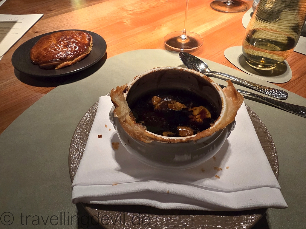 Der Abend begann klassisch und dem Wetter angemessen mit einer Waldpilzsuppe. Hier konnte man schon einmal, auch wenn das Gericht eher einfacher daher kam, merken, dass auch hier der Fokus auf der Präsentation liegt.
