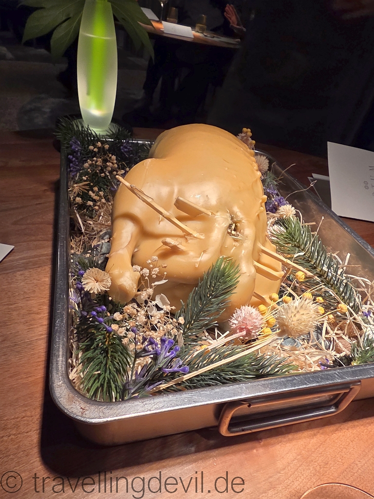 Weiter mit einer Zwiebel. So einfach und doch so komplex, denn diese wurde lange geschmort und war dementsprechend schön süß und doch stark. Dazu Schwein. Was aber etwas komplizierter war, wie uns Markus Eberle dann aber erklärte, denn ein Schinken wird wie ein Katsuobushi, also getrocknete und geräucherter Bonito, gerieben und auf der Zwiebel verstreut. Dazu Birnengel und Bohnensud, etwas Textur gaben die Tapiokaperlen in der Soße.