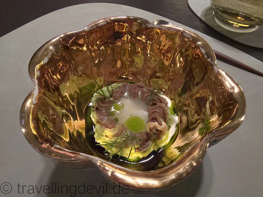 Ein kleines Küchlein aus Lamm, Minze und Saubohne gab dann einen kleinen orientalischen oder süd-französischen Ausflug, wobei uns gleichermaßen das Geschirr begeisterte. Denn sowas sieht man auf dem Niveau auch eher selten.