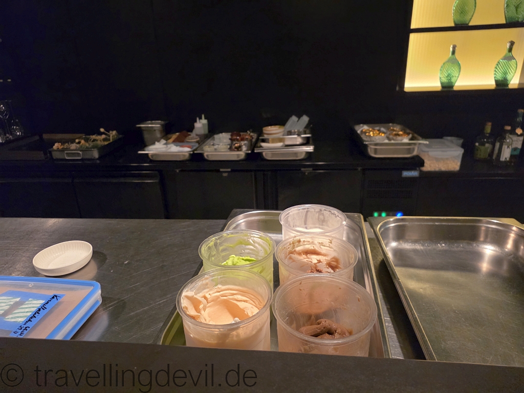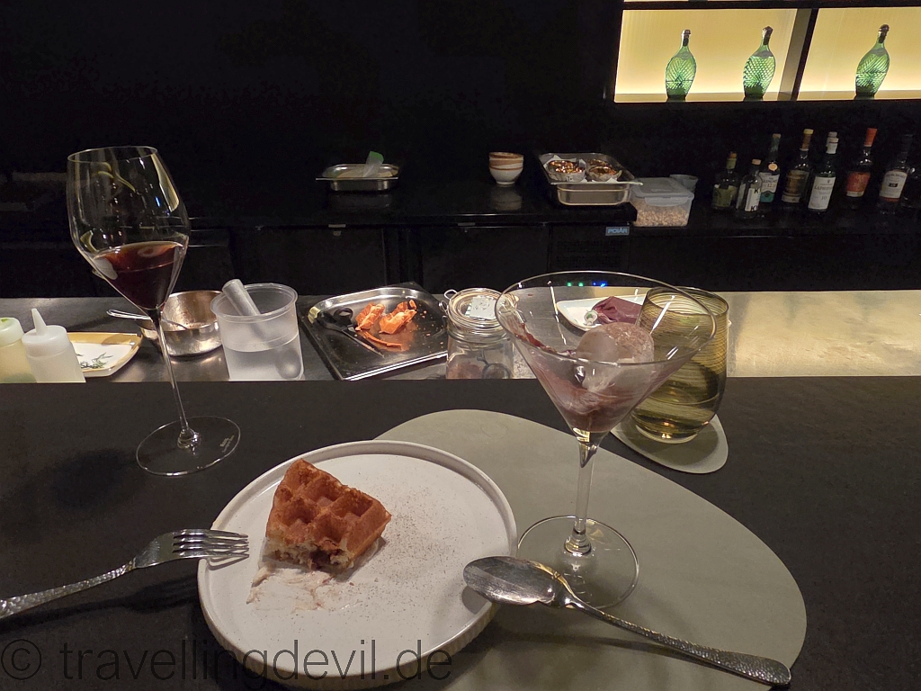 Und wie man sieht: Wir waren nicht mehr an unserem Tisch. Denn uns wurde angeboten, dass wir uns an den Tresen setzen können, um dort bei der Finalisierung des Nachtisches zuzuschauen. Na, das lassen wir uns doch nicht entgehen!