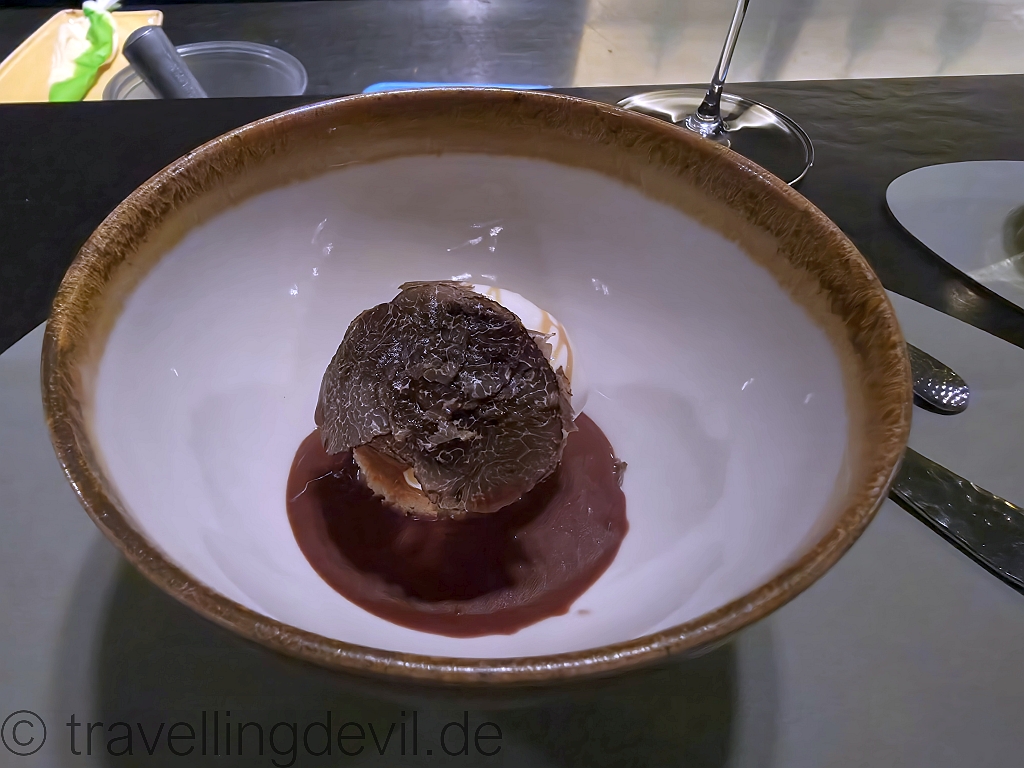 Andere wollten das nicht, gut, mehr Platz für uns. Und wir konnten auch sehen, wie die anderen Nachtische zubereitet wurden, wie die Küchencrew miteinander interagierte und auch den ein oder anderen Spruch ablassen. Generell war das wieder noch ein anderes angenehmer Teil des Abends, denn zwischenzeitlich scherzten wir mit drei Köchen und dem Service gleichzeitig herum und sprachen über den Job, die Herausforderungen mit dem Layout des Restaurants und wo man noch essen gehen sollte. Sous Chef Heiner Pingle zeichnete sich übrigens für die Nachtische verantwortlich. Und der war vorher im Coda in Berlin, einem reinen Nachtisch-Restaurant, wo er in einem Blog als „Maestro der Desserts“ bezeichnet wurde. Und seine Kreativität zeigte er im Nachtisch aus Trüffel, Weidemilch, Broiche und Haselmuss.