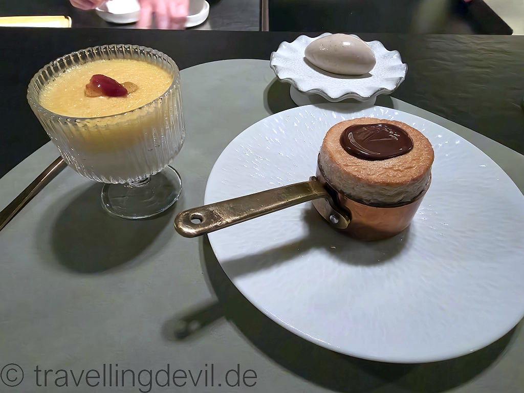 So aßen, genossen und quatschten wir während um uns herum die letzten Gäste versorgt und aufgeräumt wurde. Neben einem Espresso gab es dann noch einen letzten Happen in Form einem Souffle aus Pekannuss, einer klassischen Welfenspeise (man ist ja schließlich in Niedersachsen und hier ist das eine Spezialität) und einem Eis.