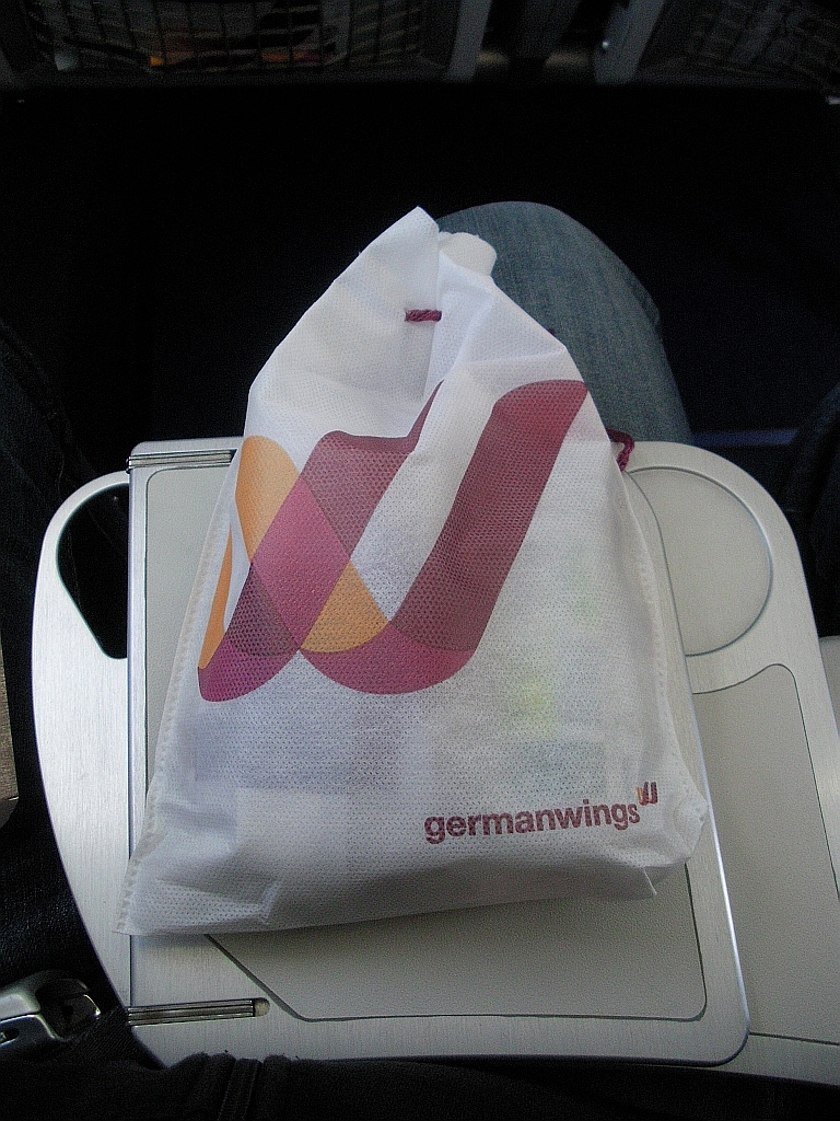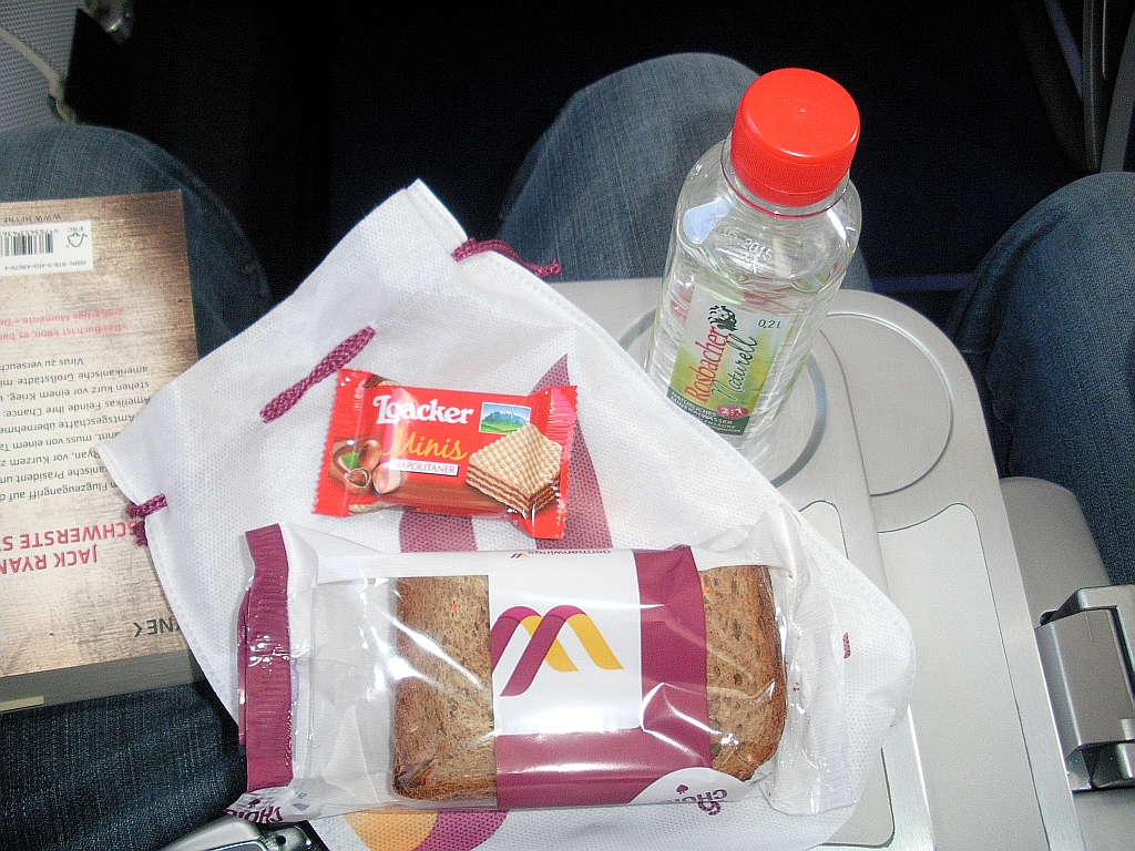 Der Flug selber war unterbrochen von einigen Turbulenzen und einem recht zügig ausgeführten „Hier haben sie ein Sack voller Essen“-Service. Glaubt ihr nicht? Hier der Sack: