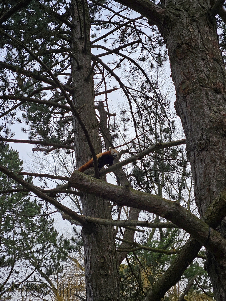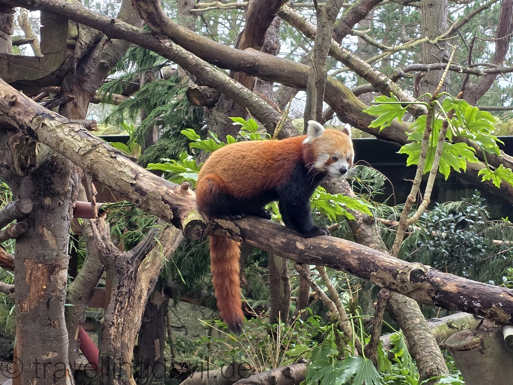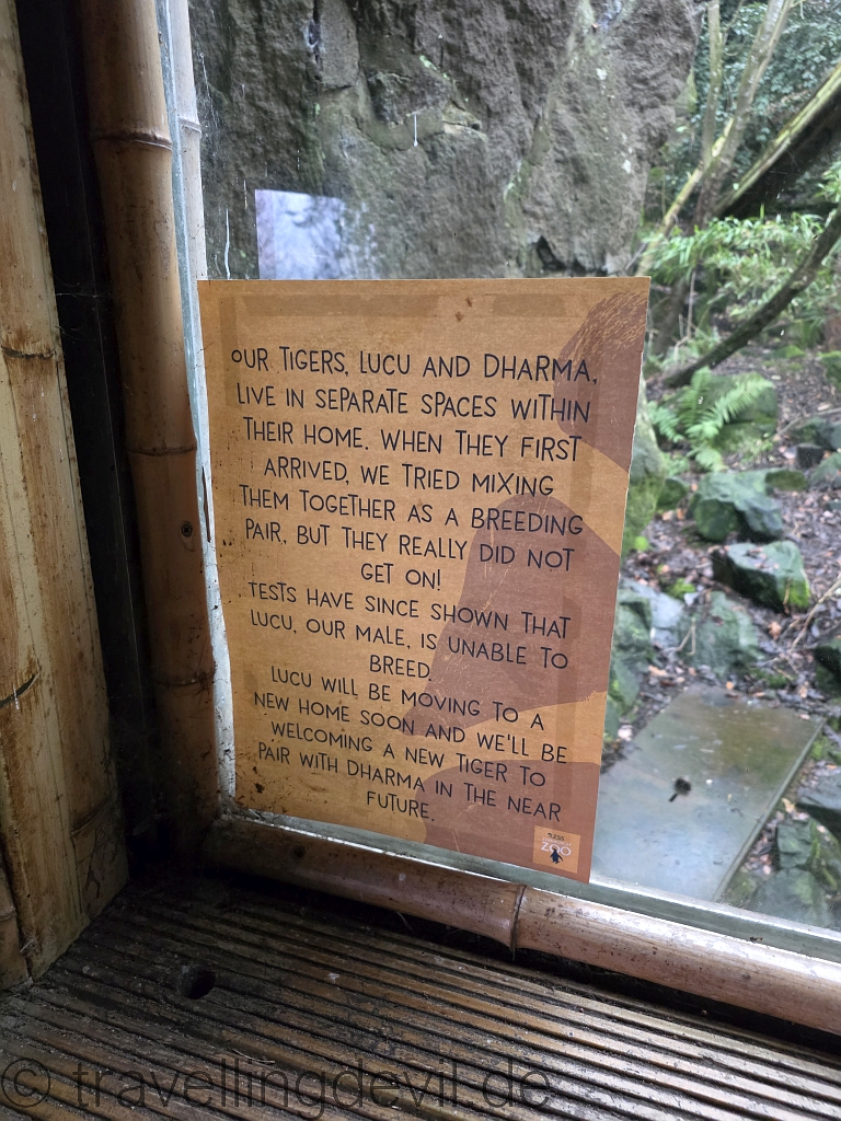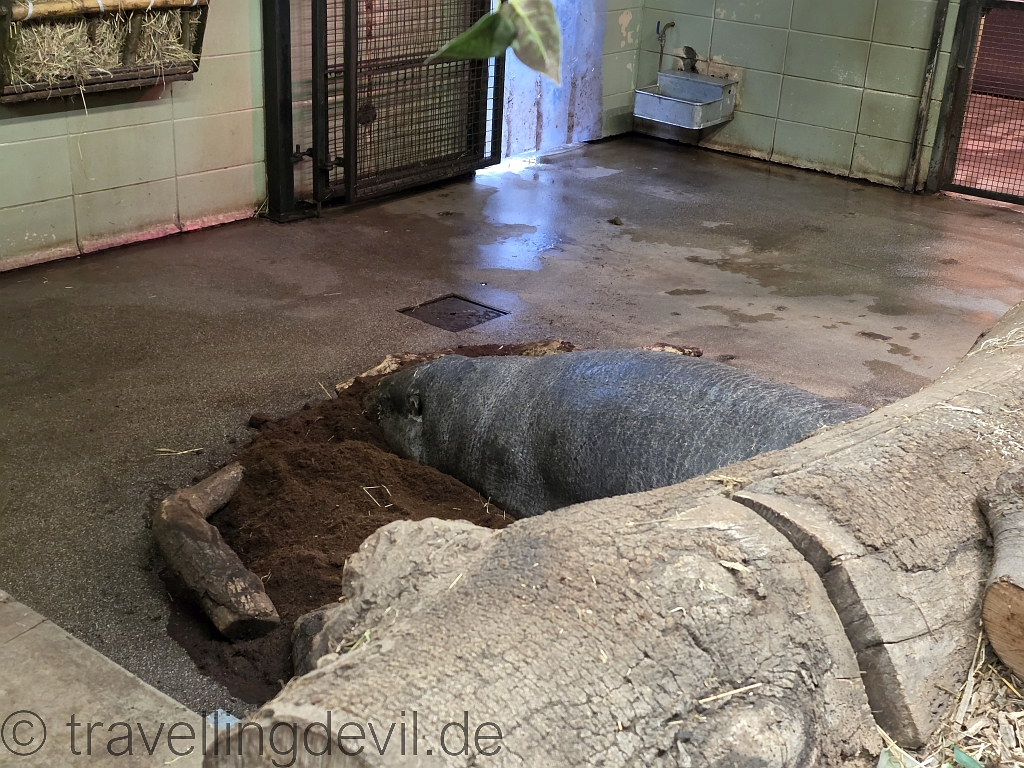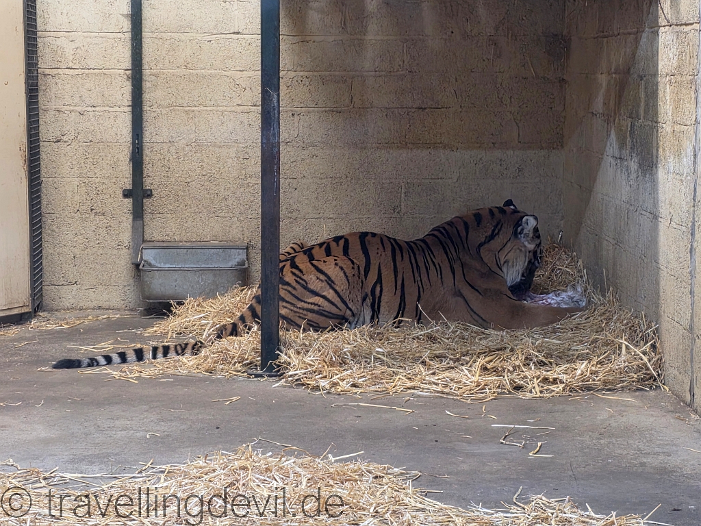 Bruce hat, wie wir letztes Jahr erfuhren, ein Morgenritual: Einmal durch das Gehege, dann kräftig die Morgentoilette auf eines seiner zwei Häuser erledigen und dann den Rest des Tages bis zum Abendessen in den zwei Bäumen schlafen. Priya ist da aktiver und muss eher bespaßt und beschäftigt werden. Mehr würden wir dann aber beim Keeper-Talk um 11 Uhr erfahren, den wir ansteuern wollten. Bis dahin war aber noch was Zeit, also drehten wir schon einmal eine kleine Runde durch den unteren Teil des Zoos.