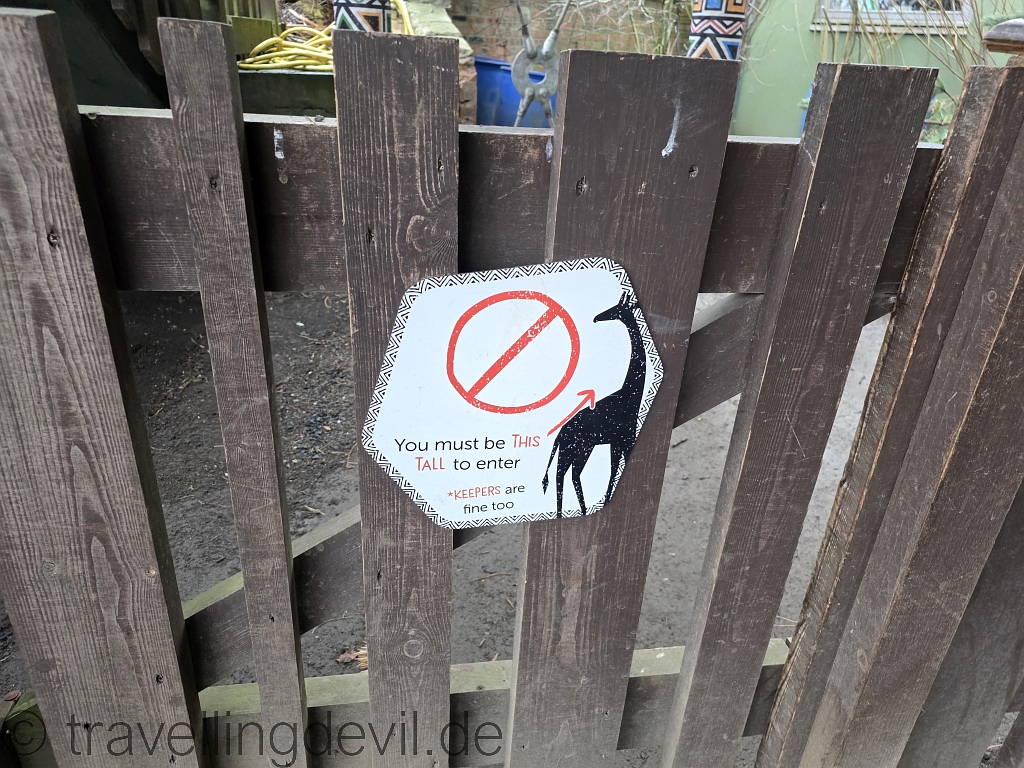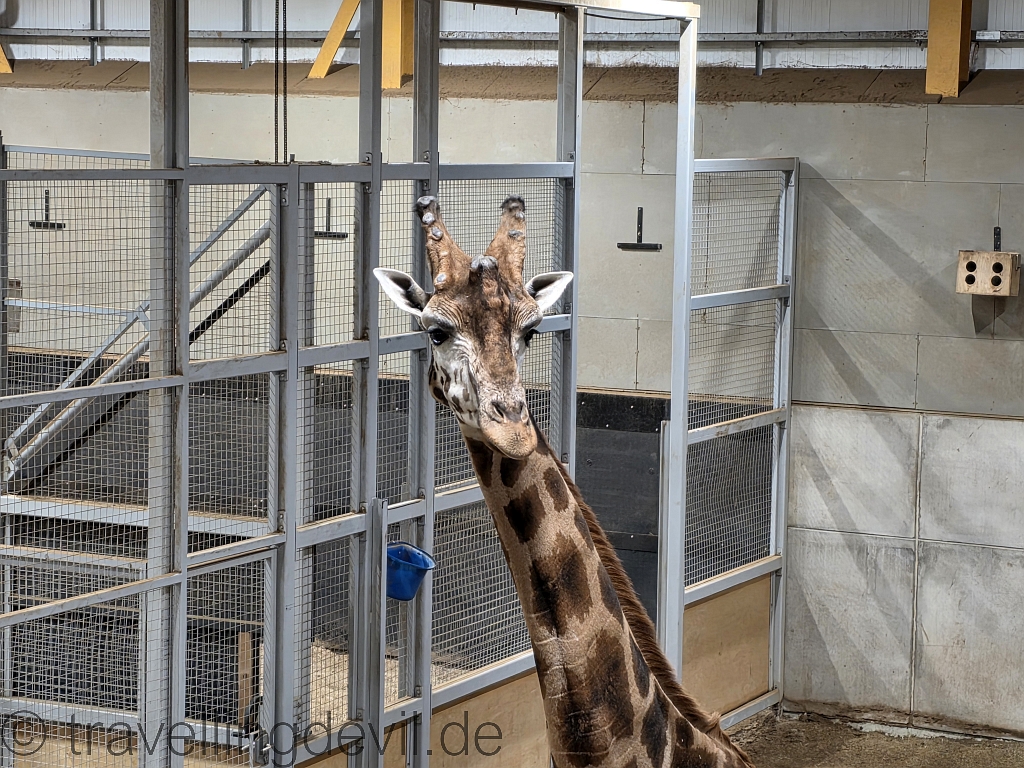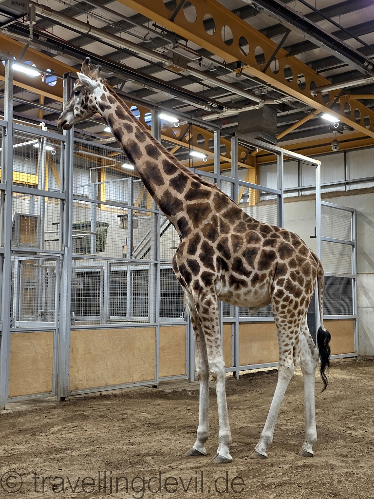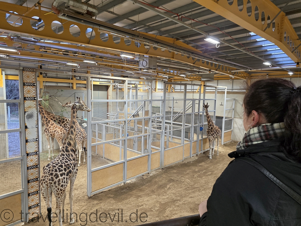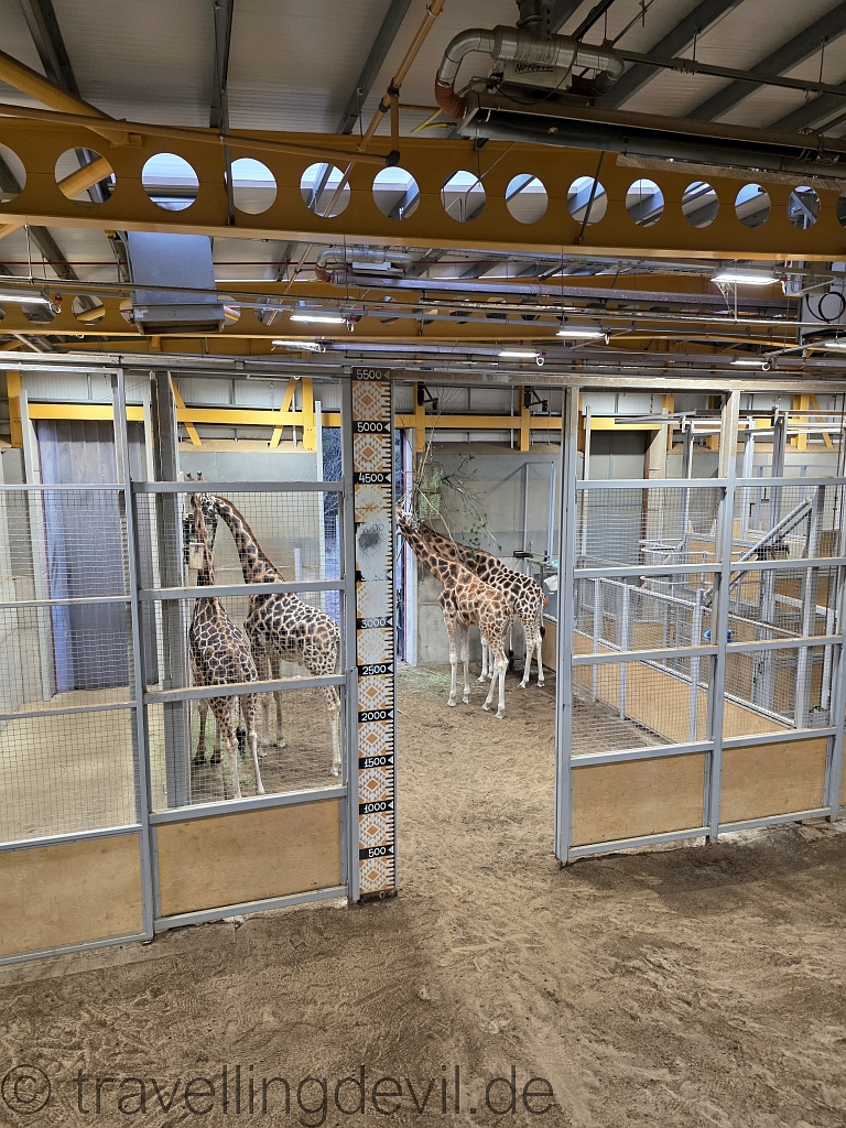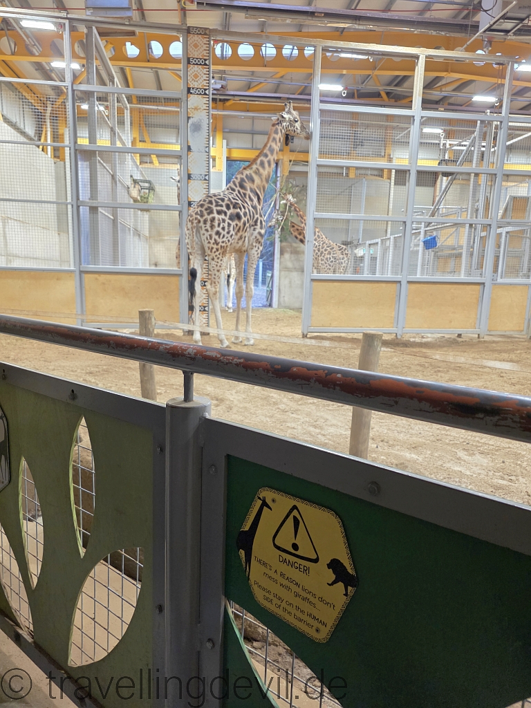 Die Halle ist neu und das sieht man auch, das Lineal an der Tür hilft, wenn man die Größe nicht gut einschätzen kann. Da wir letztes Jahr aber in Südafrika zwischen diesen faszinierenden Tieren hindurch gefahren sind, brauchten wir das nicht.