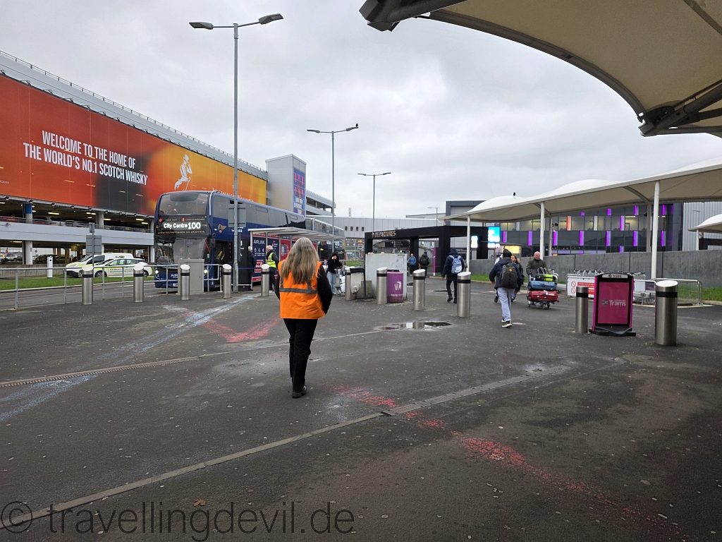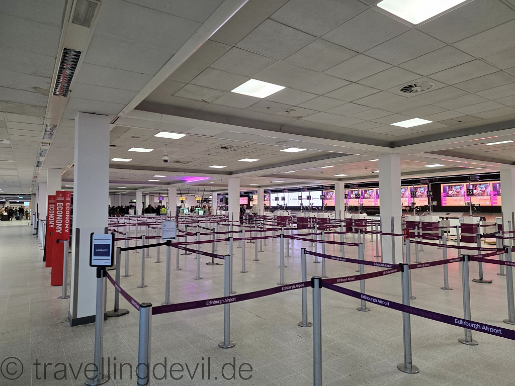 Der CheckIn in Edinburgh ist etwas anders als wir es sonst kennen: Man stellt sich an, geht dann zu einem Tisch, wo eine Dame einem die Baggage Tags an den Koffer klebt. Und dann muss man die Koffer selber auf das eine Band legen. Bringt wohl mehr Platz und soll die Prozedur vereinfachen, wir finden es immer irgendwie komisch.