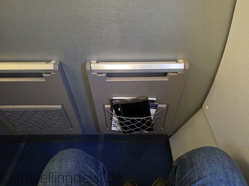Sitzplätze in der ersten Reihe. Mögen wir eigentlich nicht so richtig, denn einerseits kann man Taschen oder Rucksäcke nicht unter dem Sitz verstauen und andererseits hatte Meike den Platz am Gang, wo der Tisch in der Lehne ist. Die dadurch steif und sehr eischränkend ist.