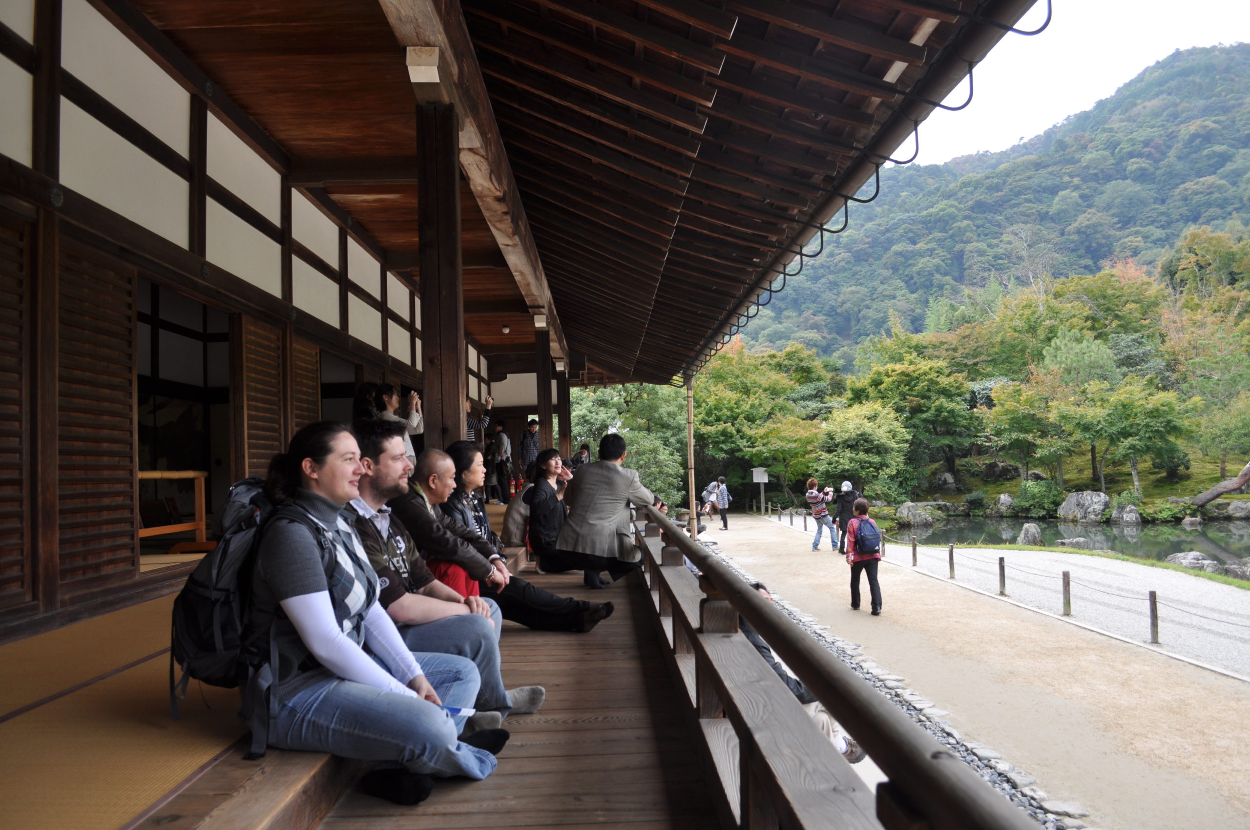 Zuerst ging es mit einem sehr vollen Nahverkehrszug nach Arashiyama, einer Region im Westen von Kyoto. Dort haben wir uns zuerst einen der Haupt-Zen-Tempel Kyoto angeschaut, den Tenryuu-In. Dort war eine sehr schöne Gartenanlage und Satoko hat uns einiges über Buddhismus und die Entstehung des Tempels erzählt.
