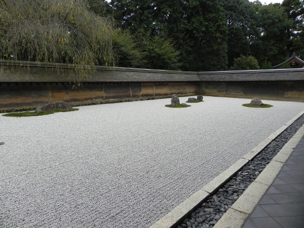 Im Anschluss daran sind wir durch einen Bambusgarten gewandert und an dem Oi Gawa Fluss herausgekommen, an dem wir dann wieder zurück zur Bahn spaziert sind. Mit der Bahn ging es dann in den Norden von Kyoto. Erster Stop dort war der berühmte „Steingarten“ Ryoan Ji. Dieser ist, wie so vieles in Japan und besonders in Kyoto, ein Weltkulturerbe. Wobei dieser Status diesem Garten den Japanern nach wohl vorwiegend deswegen zuteil wurde, weil Königin Elisabeth II. diesen Garten besucht hat und so begeistert davon war, dass sie sich für die Verleihung des Titels eingesetzt hat.