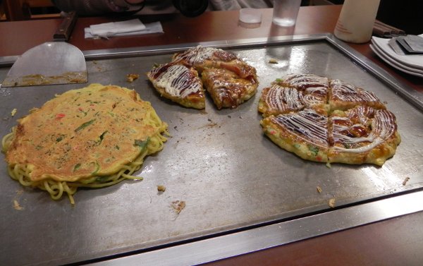 Wohl auch deswegen haben wir dann Mittag gegessen. Satoko führte uns in ein Okonomiyaki-Restaurant. Dies ist eine sehr kommunikative Art zu essen, denn man backt sich quasi selber ein Omelett mit allem möglichen auf einer Herdplatte in der Mitte des Tisches. Und schmecken tut es dabei auch noch!