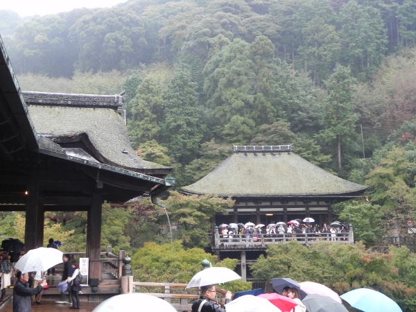 Danach ging es mit dem Bus durch den strömenden Regnen zum Kiyomizu-dera, einem buddhistischen Tempel im Osten von Kyoto an den Hängen eines Berges. Ausserdem gibt es dort noch mehrere Shinto-Schreine, die sich vorwiegend um das Thema „Liebe“ handeln, beziehungsweise dem Finden derselbigen. So gibt es zum Beispiel ein Paar „Liebessteine“, die 10 Meter voneinander entfernt sind. Es wird gesagt, dass Menschen, die mit geschlossenen Augen den Weg vom einen Stein zum anderen finden, sich bald verlieben werden. Glücklicherweise für die anwesenden kleineren Japaner brauchen Meike und ich das ja nunmal nicht, ansonsten hätten wir die vermutlich vom Berg geschubst …