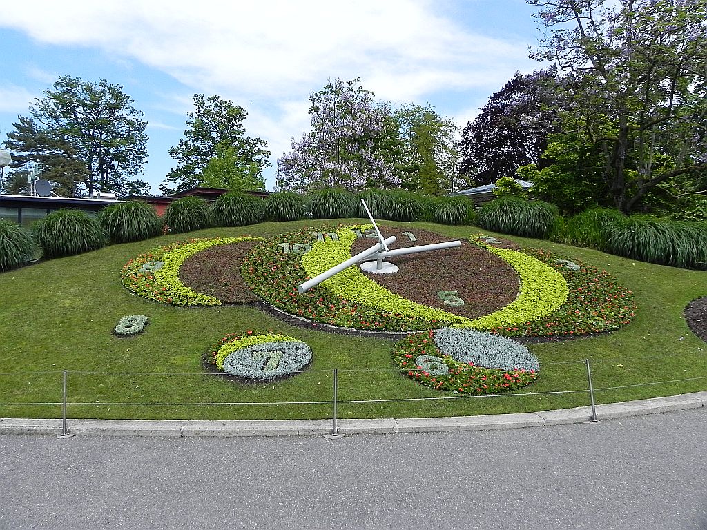 Berühmt ist der Garten für seinen Blick auf die Wasserfontäne (war ja leider nix, weil aus) und die Blumenuhr. Die hatte der Wind noch nicht sabotiert, also konnten wir sie anschauen.