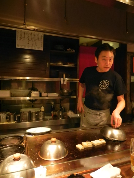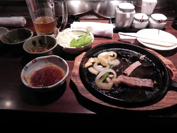 Danach ging es wieder zurück nach Kyoto – hier sind wir etwa um 18:15 Uhr angekommen. Und da man in Japan früh zu Abend isst, dachten wir uns: Das machen wir mal auch. Also rein in die nächste Einkaufspassage am Bahnhof, denn in der Regel gibt es hier eine Fressmeile. Worauf wir keinen Hunger hatten, war Fast-Food wie gestern, also studierten wir die Plastik-Speisen und die wenigen englischen Vokabeln aussen vor den Restaurants und entschieden uns für das Restaurant … ich habe keine Ahnung wie es heisst. Es serviert aber Teppan-Essen, also „heiße Platte“, d.h. das Essen wird auf einer heissen Platte zubereitet und da wir direkt an den Tresen saßen, sah das ganze dann so aus: