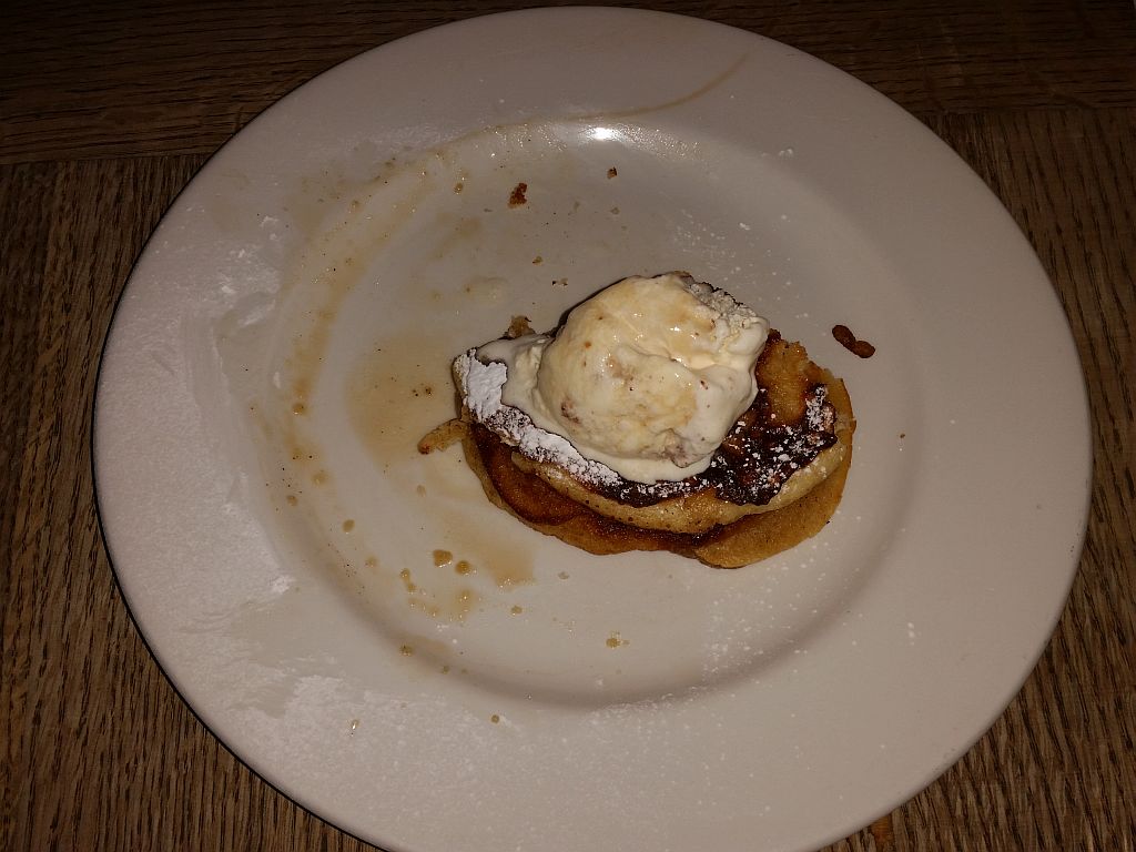 Und als Nachtisch hat sich Meike im Grunde genommen zwei Dinge bestellt: Ein Gericht aus Pancakes mit Maple Syrup und Bacon-Eis (ja, richtig gelesen: Bacon-Eis!) …