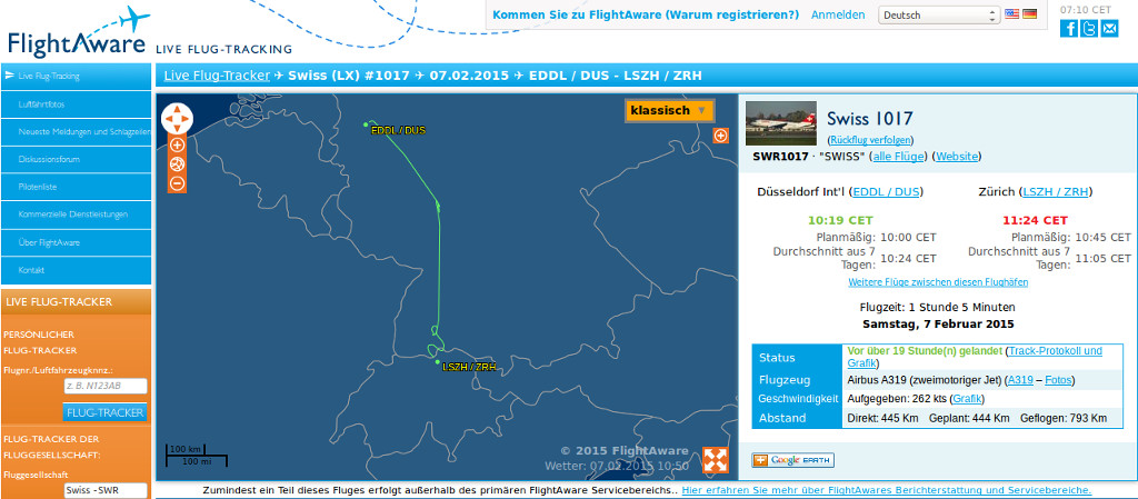 Durch diese ganzen Warteschleifen und Kurven sah unser Anflug eher so aus, als ob wir unseren Weg in die Schweiz mittels einer Verwirrungs-Taktik verschleiern mussten. Zumindest sieht das Tracking bei flightaware so aus: