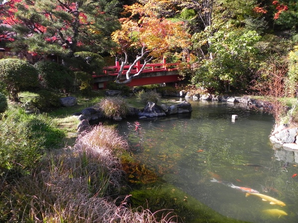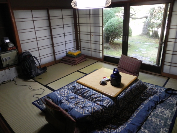 Das Kabel, was zu unserem Tisch führt, gehört zu einer unglaublich tollen Einrichtung: Dem beheizten Tisch! Man legt seine Füße unter die Decke bzw, den Tisch und unter der Tischplatte ist eine Heizung eingebaut! Wärmt super und ist voll bequem (zumindest solange man in dieser Position sitzen kann). Der Garten, den wir vom Zimmer aus erreichen, sieht auch wunderschön aus (man beachte, dass die Herbstlaubfärbung langsam anfängt):