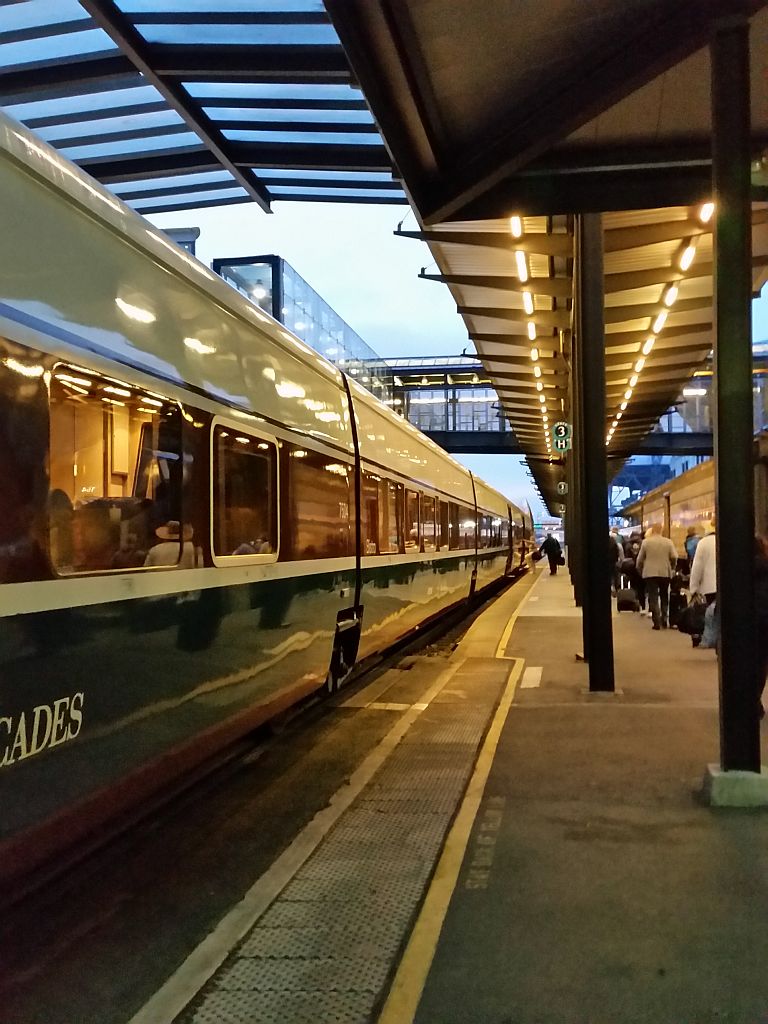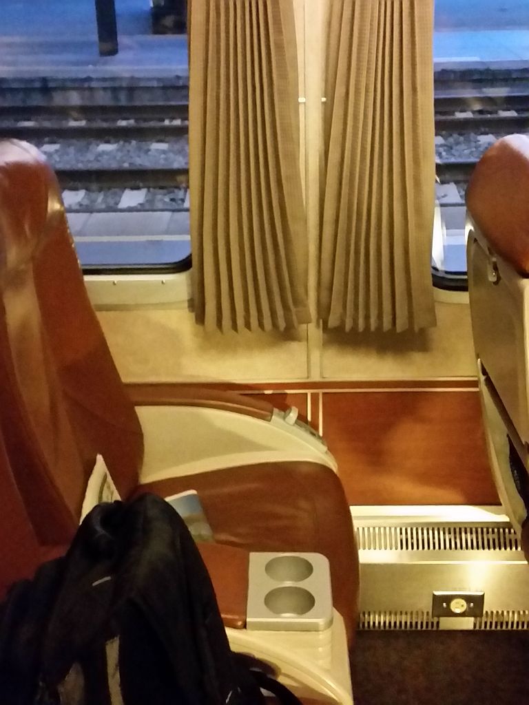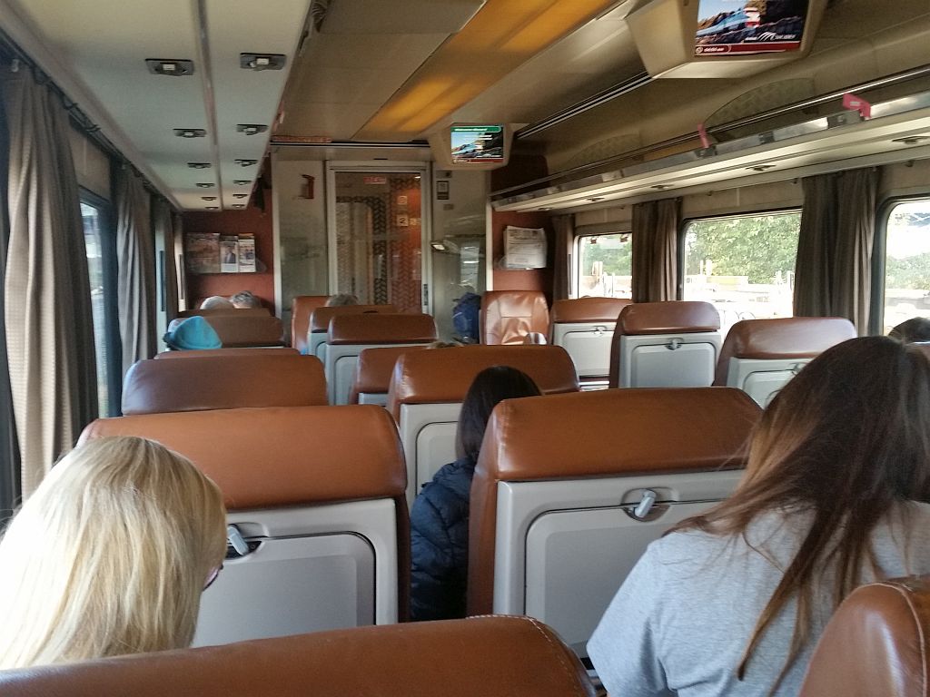 Das bedeutete, dass für einen Blick aus dem Fenster wir entweder nach vorne (über die Schulter einer amerikanischen Dame mit ihrer Tochter) oder nach hinten die Köpfe verbiege mussten. Alles nicht so doll. Die Zugbegleiterin versuchte uns noch umzuplatzieren, allerdings war der Zug wieder voll, daher keine Chance.