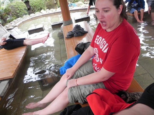 Bei unserer ersten Höllenquelle haben wir eines der dort vorhandenen Fußbäder ausprobiert. Meike war … überrascht von der Temperatur (kurz vorm Brühen) 😀