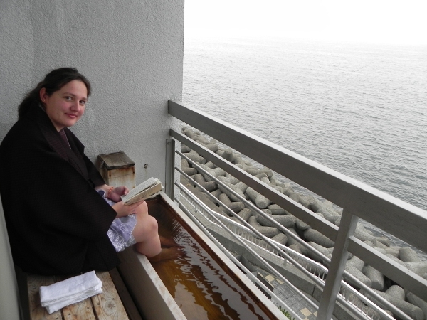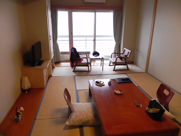 Danach ging es wieder ins Hotel/Ryokan, wo wir von einer netten Dame (die kein Wort Englisch sprechen kann) auf unser Zimmer gebracht wurden. Und dort die Überraschung: Auch wenn das Ding hier wie ein Hotel aussieht – die Zimmer sind japanisch. 10 Tatami-Matten groß mit bereitliegender Yukata und auf dem Balkon (mit Meerblick) gibt es ein Fußbad. Super schönes Zimmer …