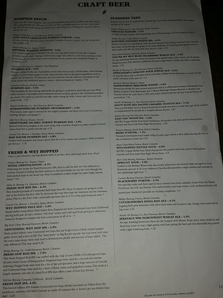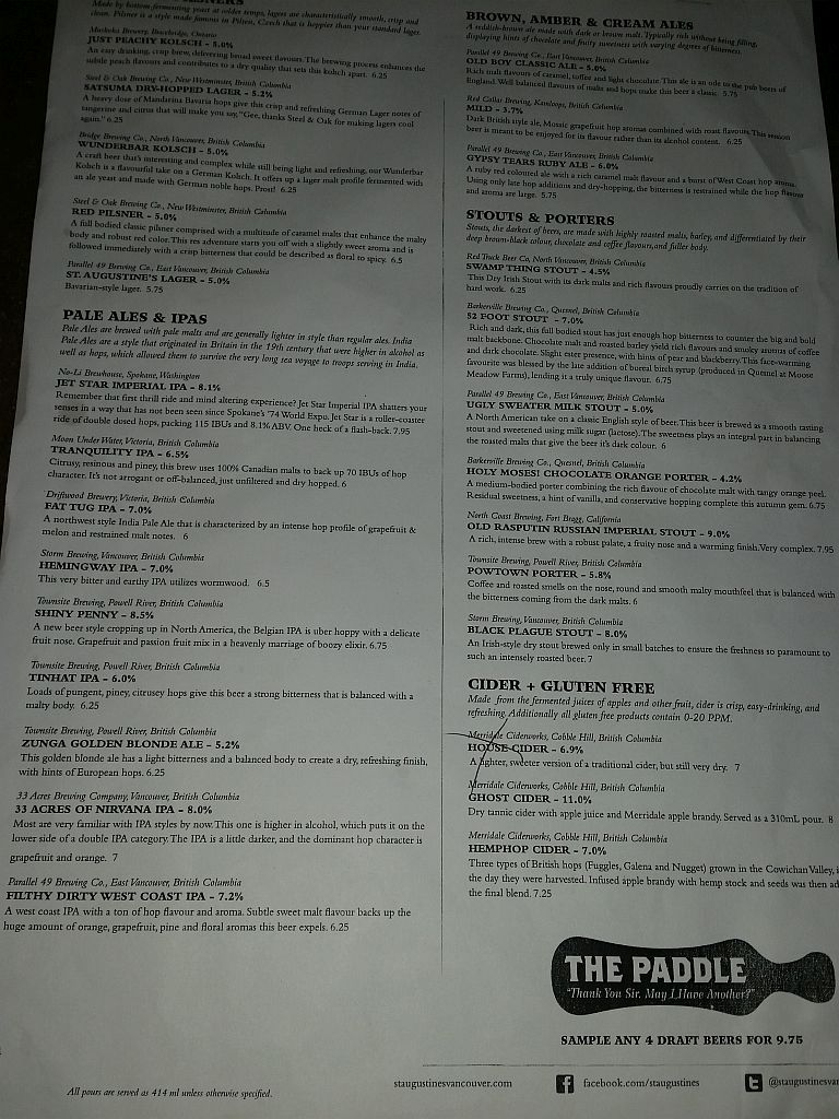 Unsere erste Wahl lag in South Vancouver und nennt sich St. Augustine’s. Im Internet kann man sehen, welche Biere dort grade an welchem Zapfhahn hängen. Und es sind immer etwa 60 …