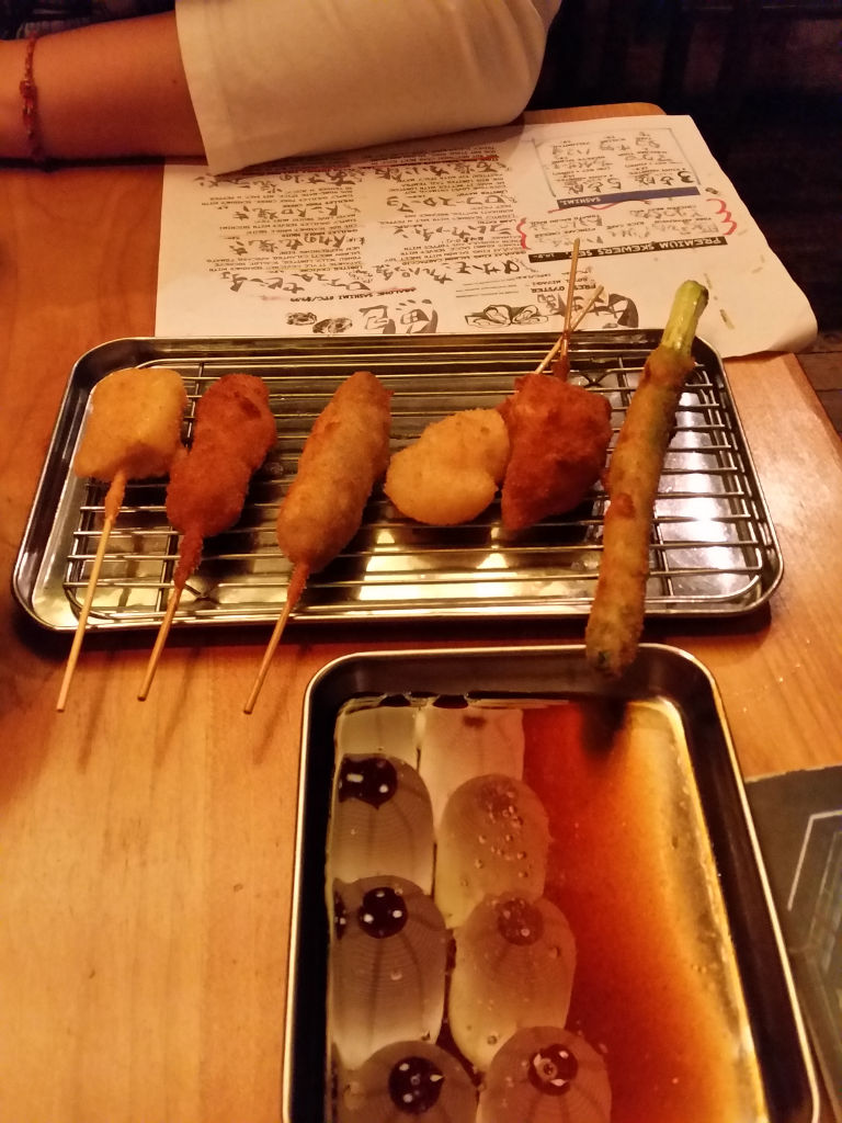 Nach 20 Minuten kamen wir an der Bar an, in der wir die einzigen Nicht-Japaner waren. Sehr witzig, auch, weil wir dort leckeres Bier und leckeres Osaka-Style (die beiden Inhaber kommen aus Osaka) Tapas bzw. Yakitori bekommen haben.