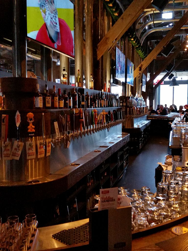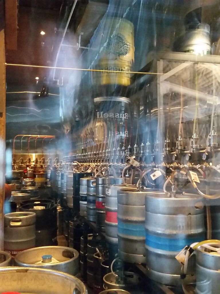 Aber die große Auswahl und die bequemen Sitze brachten uns über den Regen und nach ein, zwei Stunden ging es dann weiter. Vorher aber noch die imposante Bar und die Zapfanlage festgehalten …