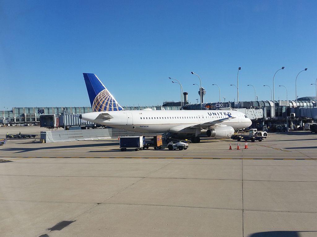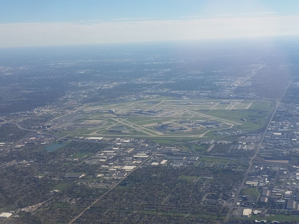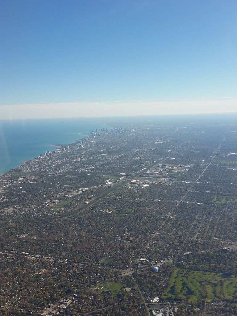Nach einem entspannten Flug landeten wir in Rekordzeit (3:10 Stunden anstellle von 3:40) in Chicago. Auf dem Weg eine schöne Aussicht auf den Flughafen (den wir umrundet haben) und auf Downtown Chicago.