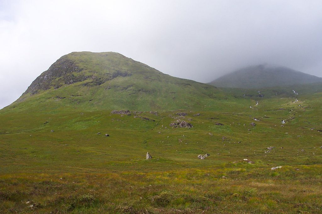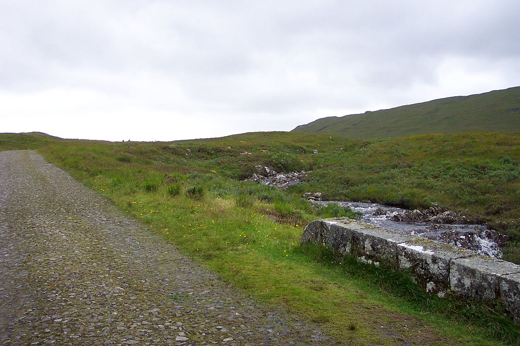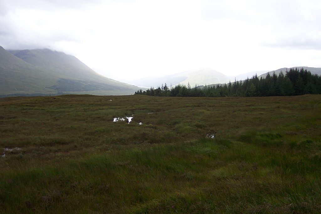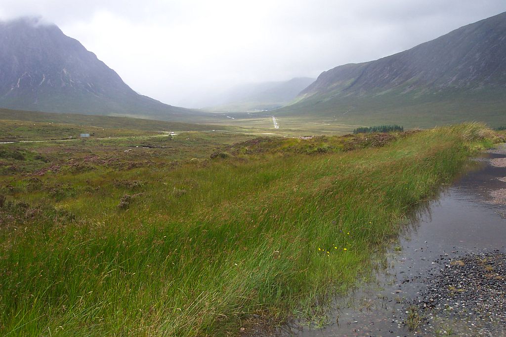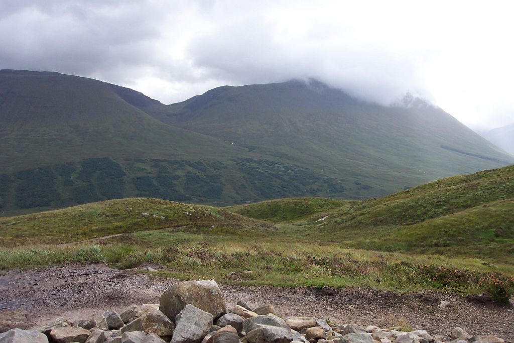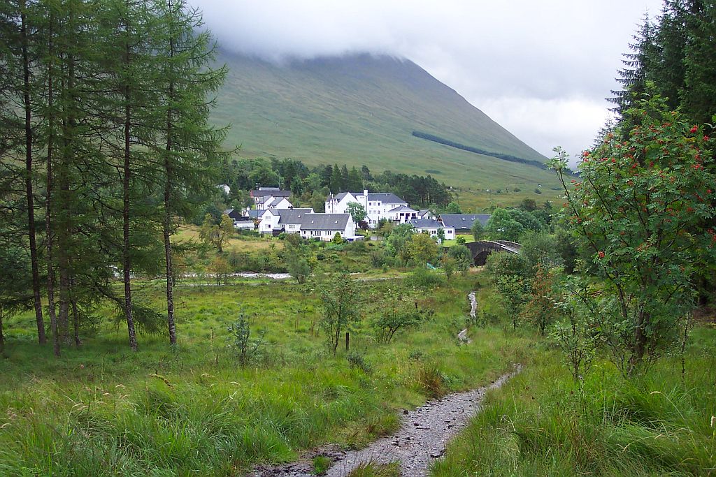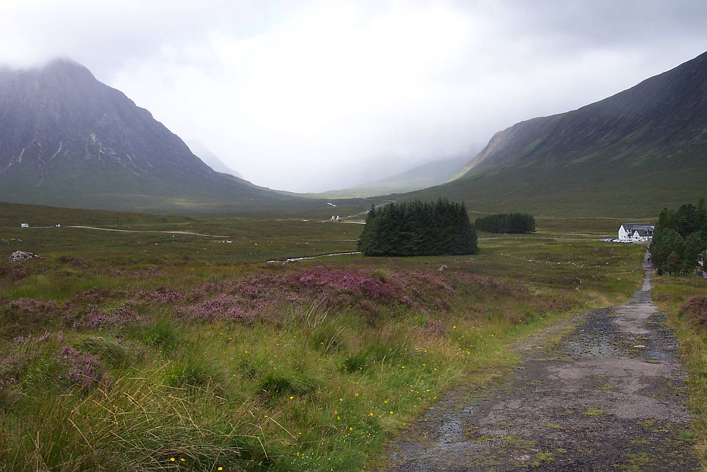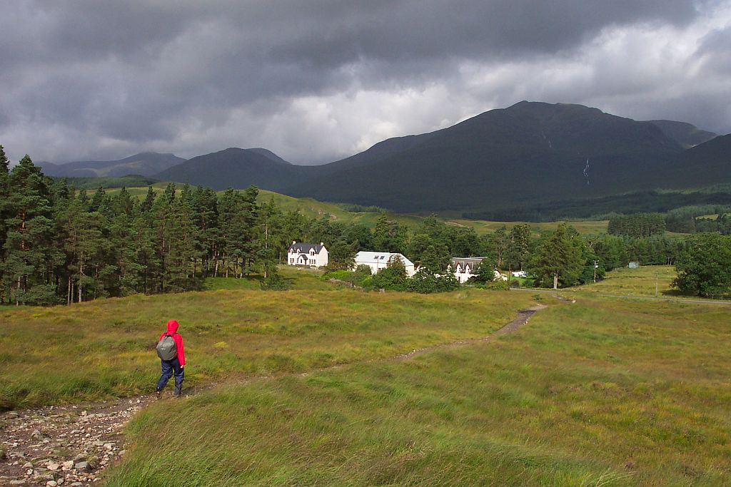 Nach einer Weile kam unser Ziel in Sicht: Das Kingshouse Hotel. Es liegt zwischen dem Ostende des Glen Coe und dem Rand des Rannoch Moores. Das Hotel ist eine der wenigen festen Siedlungen im Bereich des Moores und daher eigentlich die einzige Möglichkeit hier anzuhalten. Die Alternative wäre, die nächste Etappe auch noch zu gehen, die folgenden 14km sind aber die anspruchsvollsten, die der West Highland Way zu bieten hat.