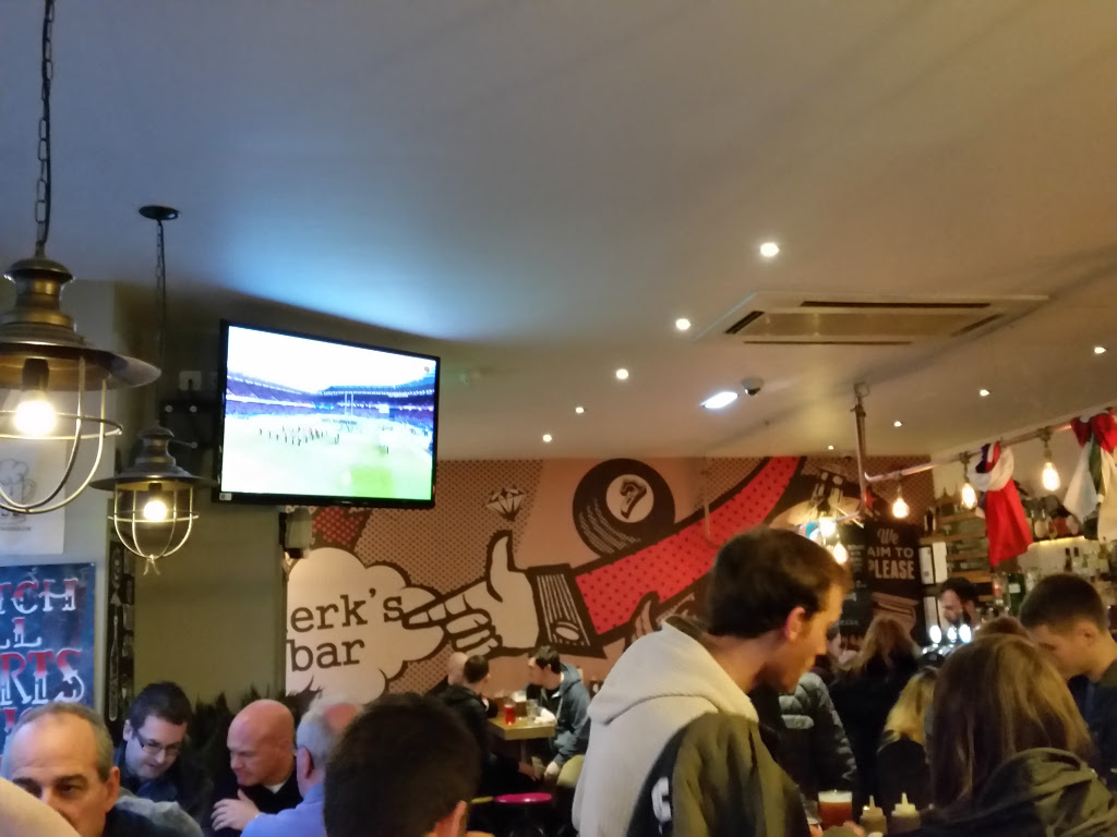In der Clerks Bar wurde gerade das Rugby-Spiel Frankreich gegen Italien gezeigt und es war nur ein Platz hinten in der Ecke. Also nix mit „früh kommen, da gibt es noch Plätze“.